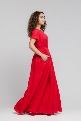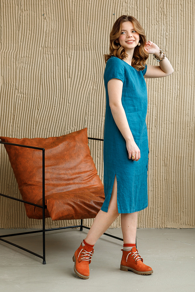 Геометрия линий, представленного платья, наверняка понравиться взвешенным и целеустремлённым натурам. Полуприлегающий силуэт лаконично подчёркивает длину миди и разрезы в боковых швах. Короткий рукав в сочетании с V – образным вырезом горловины продолжают привносить в образ строгость прямых линий. В декоре ничего лишнего. Единственный стилистический акцент модели это фактурный орнамент в нижней части полочки. Объёмные ромбы с необработанными срезами выглядят самобытно на жатой текстуре льна. А вертикальные полосы служат основой замысла дизайнера. Цветовые решения платья, весьма, скромны и наброски. И это может служить большим плюсом модели при его использовании. Оно позволяет любые цветовые сочетания обуви, бижутерии и аксессуаров. Вам не понадобиться много времени, чтобы найти идеальный дуэт к этому летнему платью.