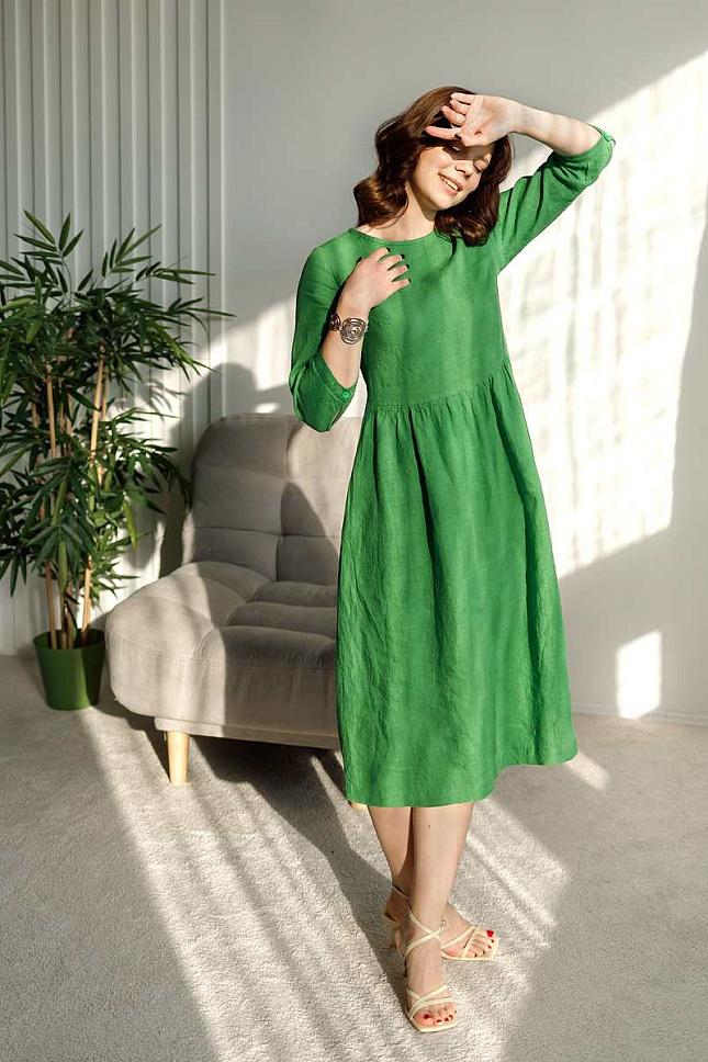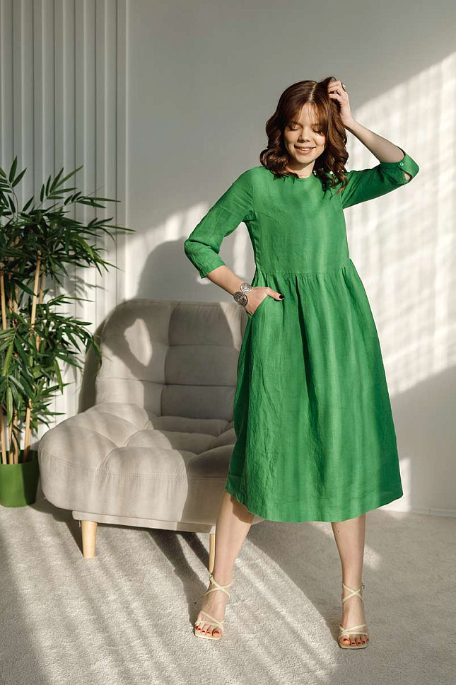 Тёплое время года позволяет нам более смело подходить к выбору одежды. Примерить на себя то, на что в зимний период ты вряд ли осмелился. Жара провоцирует нас на эксперименты с цветами, силуэтами и стилями. Интуитивно мы выбираем более комфортные и свободные вещи, которые не сковывают наших движений. Представленная модель льняного платья, вряд ли заинтересовала вас в осенне – зимний период. А вот летом оно незаменимо. Прямой полуприлегающий силуэт очарует вас своим комфортом. Талию выгодно подчеркивает мелкая сборка на юбке, создавая женственный нежный образ. Универсальная длинна чуть ниже линии колена будет хорошо сочетаться с любой обувью, будь то высокий каблук туфель или плоская подошва сандалий. Лаконичность и сдержанность декоративных элементов оставляют вам «поле» для фантазии. Вы можете на своё усмотрение «расставить» цветовые и стилистические акценты. А уникальные свойства натурального льна, из которого изготовлена модель, вы сможете в полной мере оценить, став обладательницей этого платья.