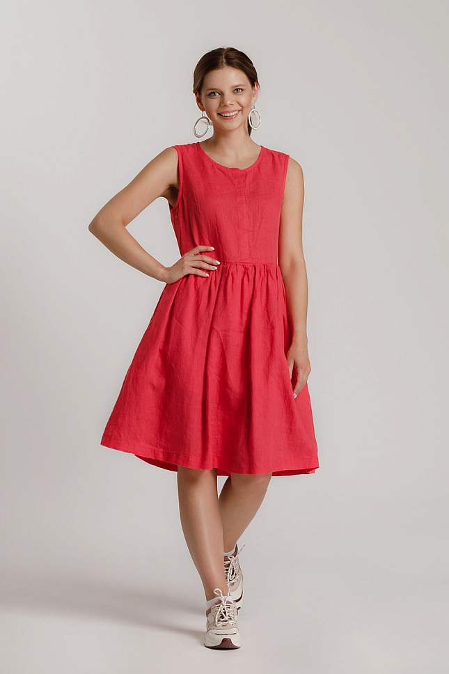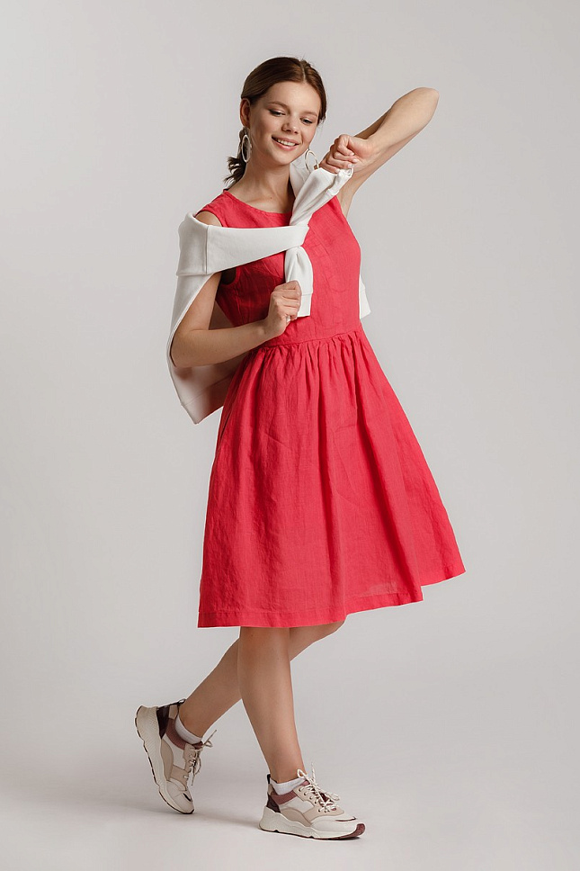 Женщинам и девушкам весьма затруднительно продемонстрировать свою элегантность и женственность, будучи одетой в зимнюю куртку, пуховик или пальто. А вот летний сезон позволяет это сделать на все 100 процентов. Наиболее удачно справляются с этой задачей – лёгкие летние платья и сарафаны, которые как нельзя лучше выказывают женские прелести. Обратите внимание на представленный сарафан из льна. Его X- образный силуэт прекрасно подчеркнёт женскую талию. Длинна модели варьируется около линии колена, поэтому подойдет женщинам и девушкам любого роста. В боковых швах юбки расположены карманы, которые отвечают за функциональную составляющую модели. Лиф сарафана – простой и лаконичный. Круглый вырез горловины, открытые руки и декоративная планка по центру полочки – универсальные конструктивные и стилевые решения. Однако, не каждый сарафан может похвастаться наличием подъюбника, который контрастирует с основным цветом, ярко демонстрируя себя. Такое оригинальное решение не может не привлечь к себе внимание девушек и женщин ищущих «что-то необычное».