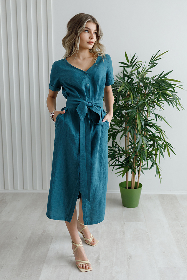 Силуэт прямого платья всегда притягивает взгляды. Невозможно не вдохновится красотой женских линий. Такое впечатление особенно выразительно, когда модель платья подчёркивает достоинства и скрывает недостатки. Заметим, что не каждая модель способна учитывать все нюансы женского тела. Обратите внимание на представленную модель платья! Именно полуприлегающий прямой силуэт этой модели станет универсальным решением для любой женской фигуры. Длинна – чуть ниже линии колена хорошо подчёркивает красоту женских ног, позволяет самые разнообразные сочетания обуви. Талия подчёркнута широким кушаком-поясом, который образует кокетливые складки, привнося в образ лёгкую небрежность- образный вырез горловины визуально удлиняет шею, рисуя красивую линию декольте. Центральная планка – застёжка выстраивает вертикаль, которая подчёркивает стройный женский силуэт. Натуральный лён, из которого сделано платье – как неоспоримое преимущество перед другими аналогичными моделями.