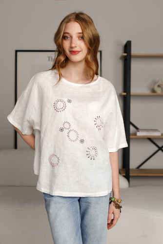 В наши дни каждая женщина может по соперничать с мужчинами по количеству рубашек в своём гардеробе. И это вполне обоснованно. Универсальность и удобство этого элемента гардероба по праву заслуживает внимания и любви. Женщины внедрили рубашки во все аспекты своей жизни. Она может быть и для работы, и для отдыха, и даже для торжественных случаев. Поэтому дизайнеры без устали предлагают всё новые и новые варианты. Наши дизайнеры не отстают и предлагают обратить внимание на представленную модель! Прямой полуприлегающий силуэт хорошо маскирует все несовершенства фигуры. А длина чуть ниже линии бёдер позволяет использовать рубашку, как поверх поясных изделий, так и в заправленном виде. Невозможно представить этот элемент гардероба без центральной застёжки – планки на пуговицы и стояче – отложным воротником. Но обратите внимание, особенностью этого воротника являются небольшие размеры отлётов, которые подчёркивают утончённое женское начало. Кокетка на спинке дополнена складками для удобства использования и таким неброским акцентом, как петелька для подвешивания, которая в ходе истории стала просто декоративным элементом. Ярко «заявляет» о себе контрастная машинная вышивка на полочке. Затейливые витиеватые узоры стильно отличают нашу льняную рубашку из большого разнообразия других предложений.