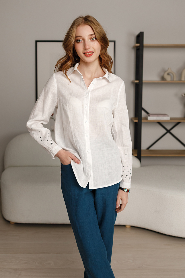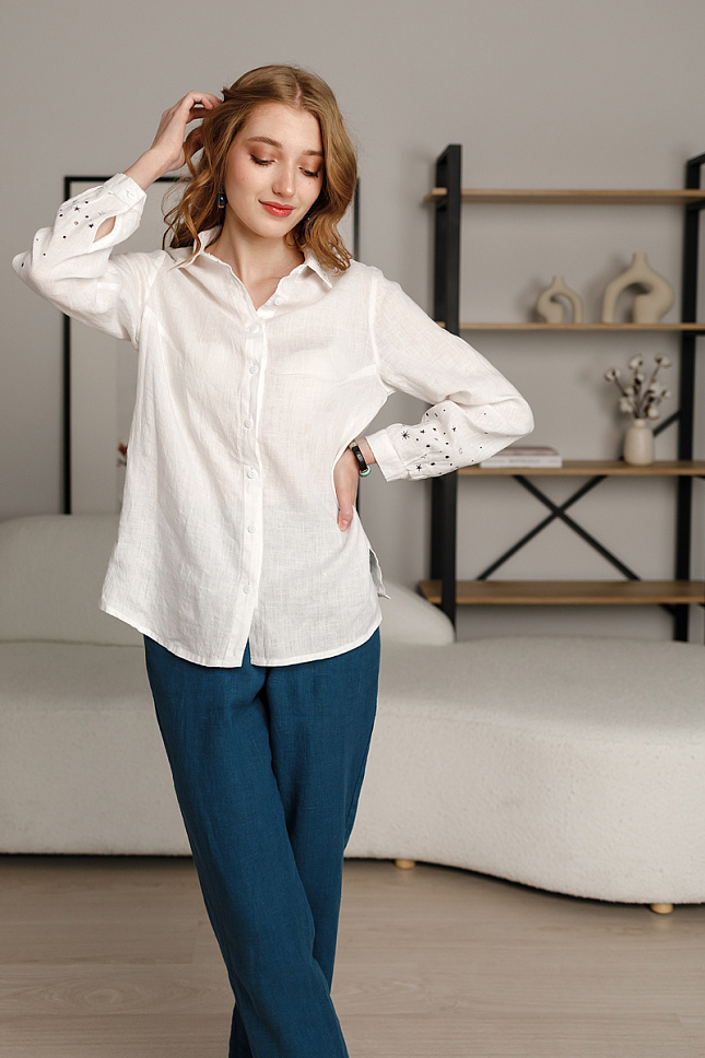 Современная мода уже давно избавилась от гендерных предрассудков, сделав сугубо мужские предметы гардероба – женскими. В гардеробе каждой практичной женщины или девушки должно присутствовать несколько рубашек разных фасонов и расцветок. Наличие этого элемента сильно упрощает задачи по составлению дуэтов, экономя время. Обратите внимание на представленную модель рубашки из натурального льна! Классические стилевые решения делают эту модель удобной на каждый день. Прямой полуприлегающий силуэт в сочетании с длиной чуть ниже линии бёдер хорошо сочетаются с различными поясными изделиями, будь то классическая юбка или менее формальные джинсы. Невозможно представить рубашку без центральной застёжки – планки на пуговицы и стояче отложного воротника. Это обязательные атрибуты модели. Нежно и деликатно выглядят небольшие складки на детали спинке, которая соединена с кокеткой. Манжеты по низу рукава, застёгнутые на пуговицу – практичное решение для повседневной одежды. На жатой текстуре натурального льна очень гармонично выглядит машинная вышивка. Неброский мелкий узор в тон основного материала деликатно подчёркивает оригинальность этой модели. Цветовая палитра позволит каждой из вас выбрать именно «свою» рубашку.