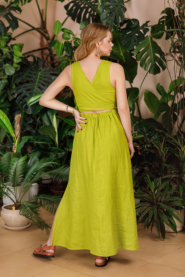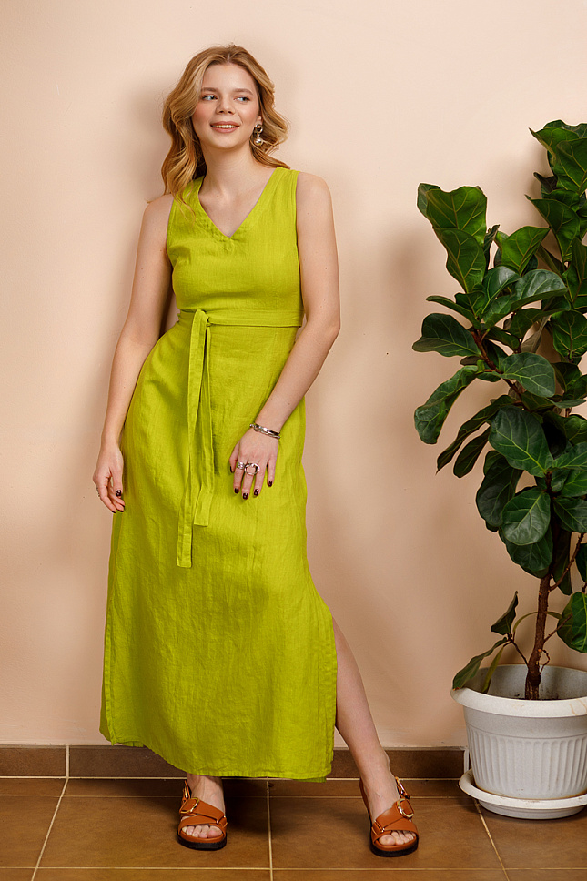 Прямой сарафан прилегающего силуэта – это всегда удачное приобретение для летнего гардероба. А если он изготовлен из натурального льна – автоматически становится незаменимой вещью. Лён обладает уникальными свойствами, которые обеспечат потрясающий комфорт даже в сильный летний зной. Прямой крой модели в сочетании с макси длиной наделяют женский силуэт дополнительными сантиметрами роста, что придаёт стати и грации. Минимализм декора и линий кроя ничуть не преуменьшают достоинств модели. V – образный вырез горловины визуально удлиняет шею, создавая красивую линию декольте. Широкая бретель надёжно скроет секреты вашего белья от посторонних взглядов. Центром притяжения и восхищения является спинка, которая демонстрирует женское очарование и кокетство. По средствам завязок детали кроя можно фиксировать различными способами, что даёт возможность в большей или меньшей степени открывать спинку и задавать различную стилистику образу. Если перехлестнуть завязки и зафиксировать их спереди – получится сдержанная и скрытная спинка на запах. А можно завязать бант сзади, что позволит продемонстрировать изгибы загорелой спинки и придать образу романтики.