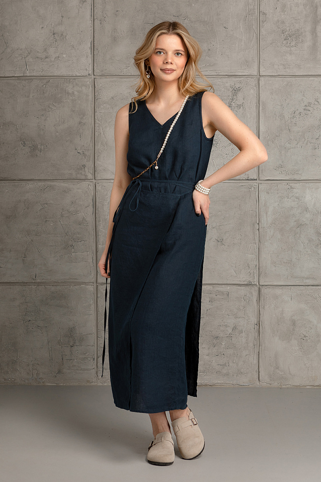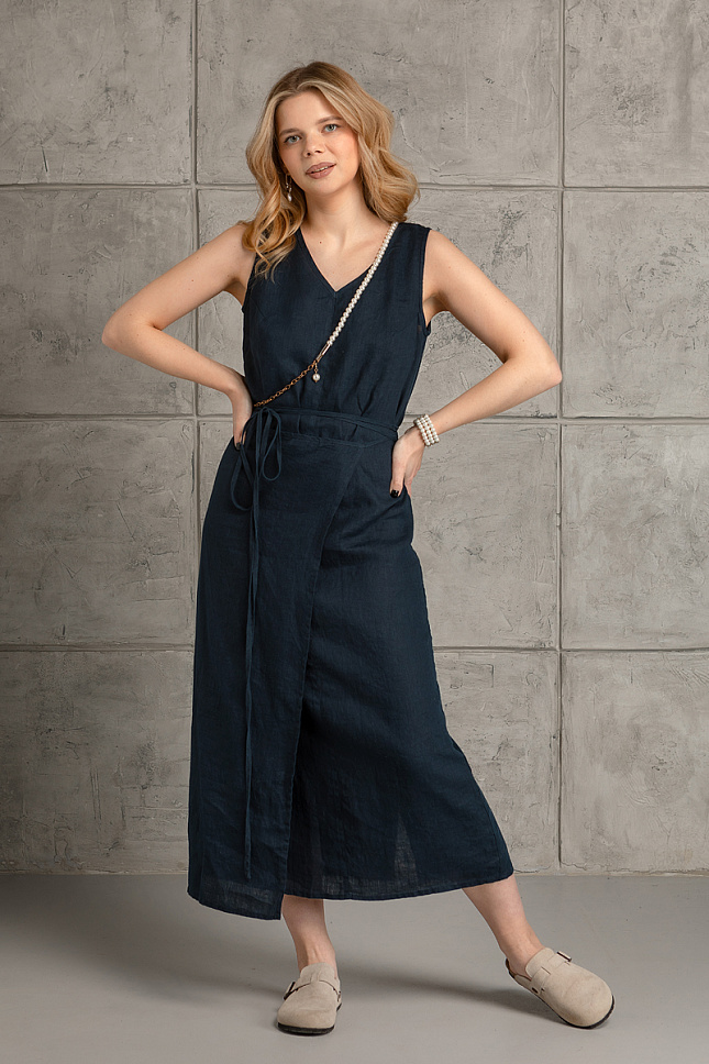 Прямые линии и чёткий силуэт – как философия жизни. Представленная модель льняного сарафана будет понятна даже самой неискушённой моднице. Прямой силуэт в сочетании с длинной миди практичен и универсален. Полуприлегающие формы хорошо скроют несовершенства фигуры и подойдут на любое телосложение. Сдержанный декор великолепно впишется в различные жизненные ситуации. Это могут быть деловые будни или отдых за городом. Длина модели позволяет сочетания с самой разнообразной обувью, будь то туфли на изящном каблуке, или босоножки на устойчивой танкетке, а динамичные натуры смело могут надевать обувь на сплошном ходу. А теперь обратим внимание на детали! V- образный вырез горловины визуально вытягивает шею, создавая утончённые женские черты и красивую линию декольте. Широкая бретель надёжно скроет «подробности» нижнего белья, не внося изъяны в ваш образ. Крой юбки демонстрирует имитацию запаха, создавая эффект многослойности. Такой конструкторский приём привносит оригинальности в модель. Линия талии умело подчёркнута тонким шнуром, который многократно опутывает её, а удлинённые концы создают две стильные вертикали. Жатая текстура натурального льна великолепно воплотила все задумки дизайнера.