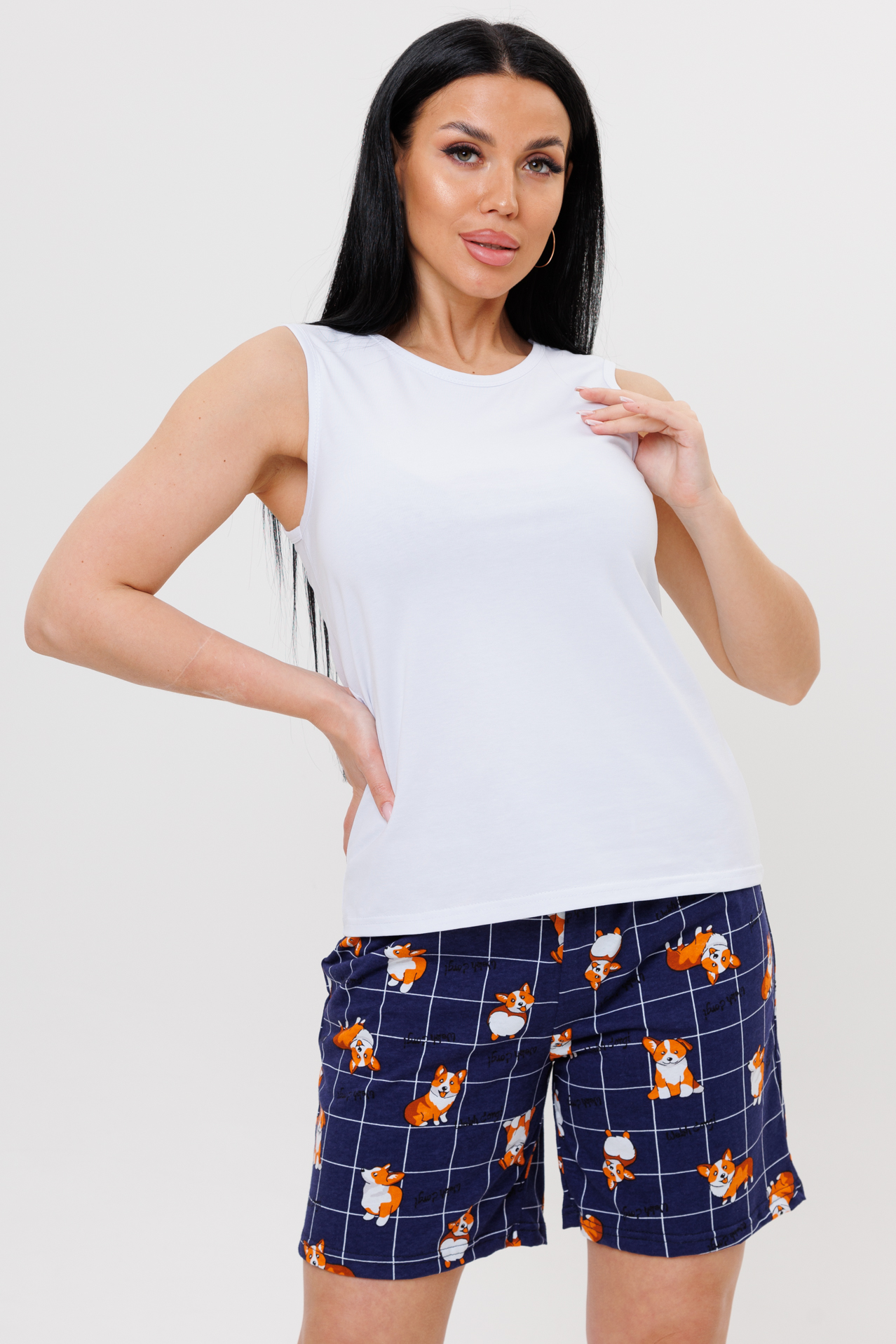Женская пижама сшита из хлопкового полотна. Комплект выполнен в молодежном стиле и состоит из майки и шорт. Майка сшита из трикотажного полотна кулирки с добавлением лайкры, благодаря чему она практически не тянется в длину и плотно облегает тело, подчеркивая все его достоинства.  Округлая горловина и проймы отделаны кантом в тон основного цвета майки. Прямые шорты на мягкой широкой эластичной резинке сшиты из ткани компаньона 100 % хлопка с оригинальным принтом.