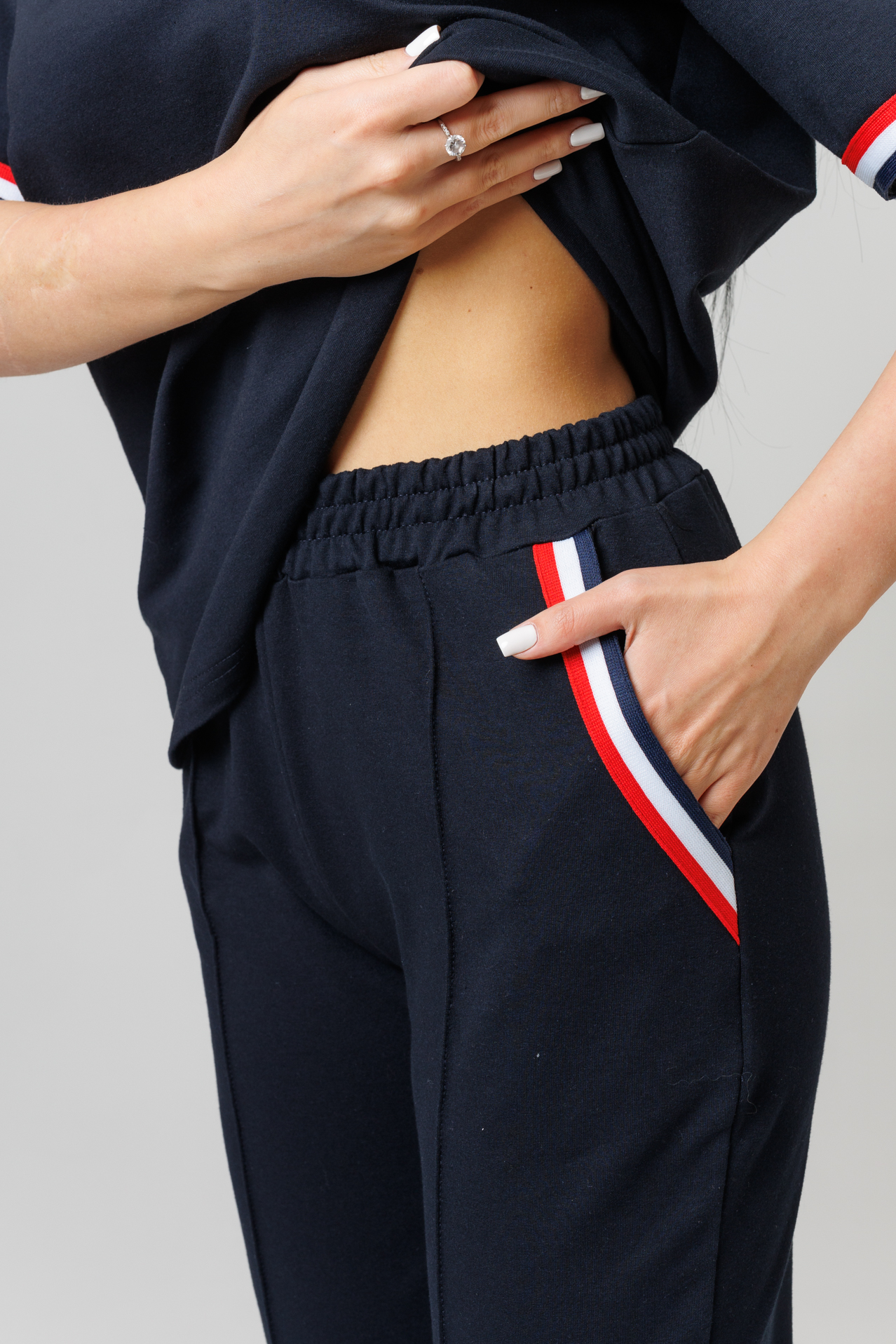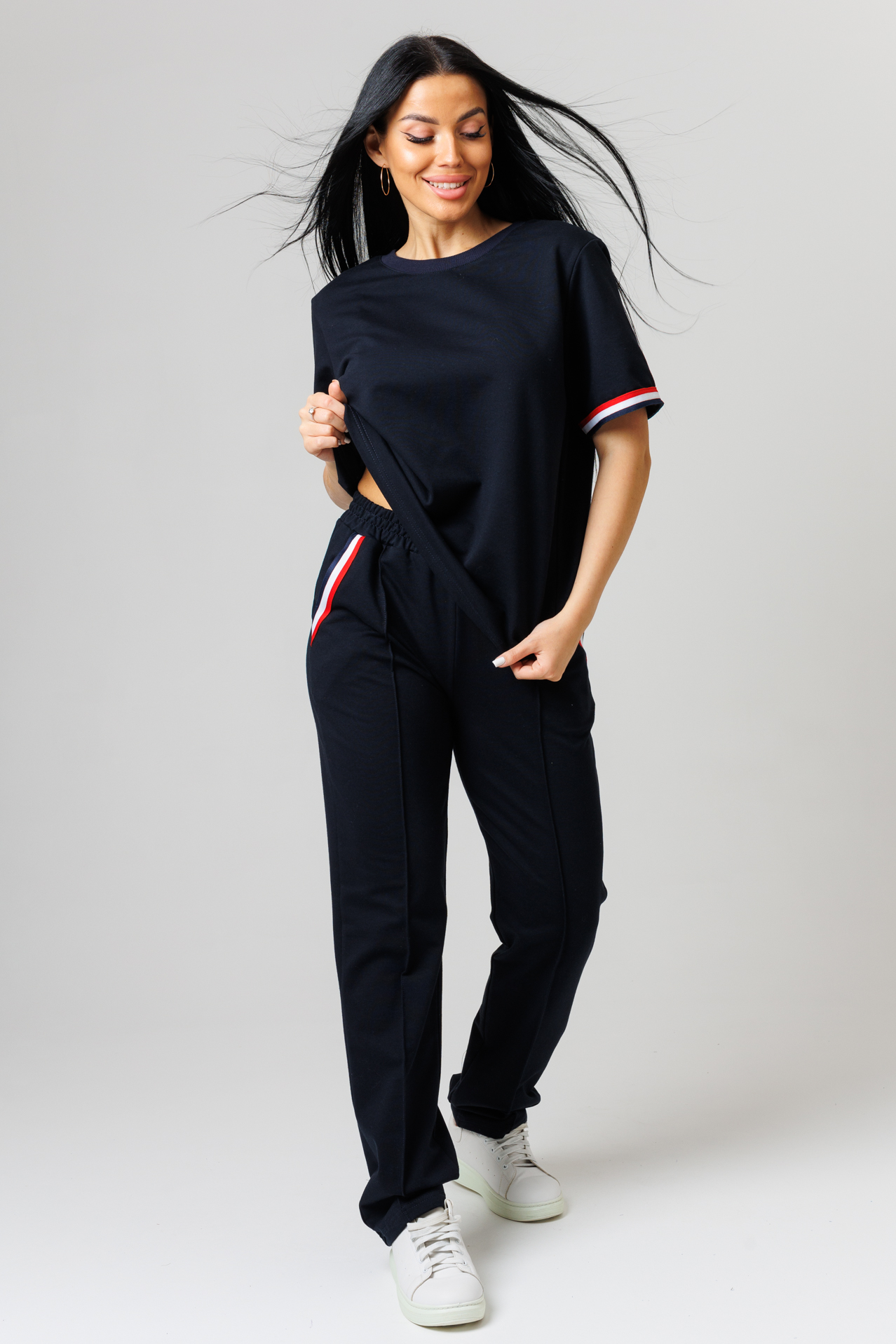 Женский костюм с брюками выполнен из трикотажного полотна. Костюм состоит футболки и брюк. Умерено свободная футболка имеет округлый вырез, короткие втачные рукава декорированные трикотажной вязаной тесьмой. Брюки прямые с фиксированными стрелками и боковыми карманами. Карманы на брюках отделаны трикотажной вязаной тесьмой. Стильный легкий модный костюм с брюками идеально походит для тренировок, дома, офиса, прогулок и путешествий.  Он сшит по универсальным лекалам, которые позволяют скрывать все недостатки фигуры и выгодно подчеркнуть ее достоинства.