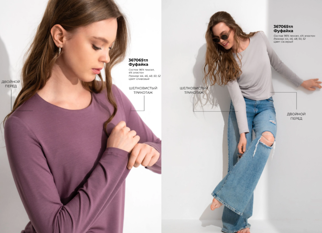 "Описание: Фуфайка прямого силуэта из трикотажного полотна тенсель с эластаном. Втачной длинный рукав. Двойной перед до линии лифа. Округлая горловина с внутренней окантовкой по спинке.