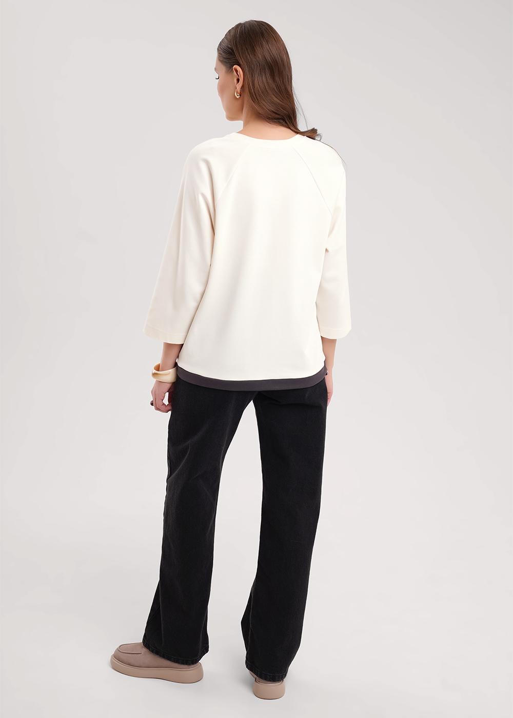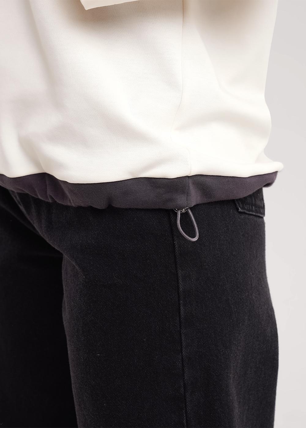 "Описание: Джемпер свободного кроя из эластичного хлопкового полотна. Рукав реглан длиной 7/8. Округлая горловина с обтачкой. По низу изделия притачная контрастная кулиса с внутренним шляпным шнуром и стопором. Спереди принт.
