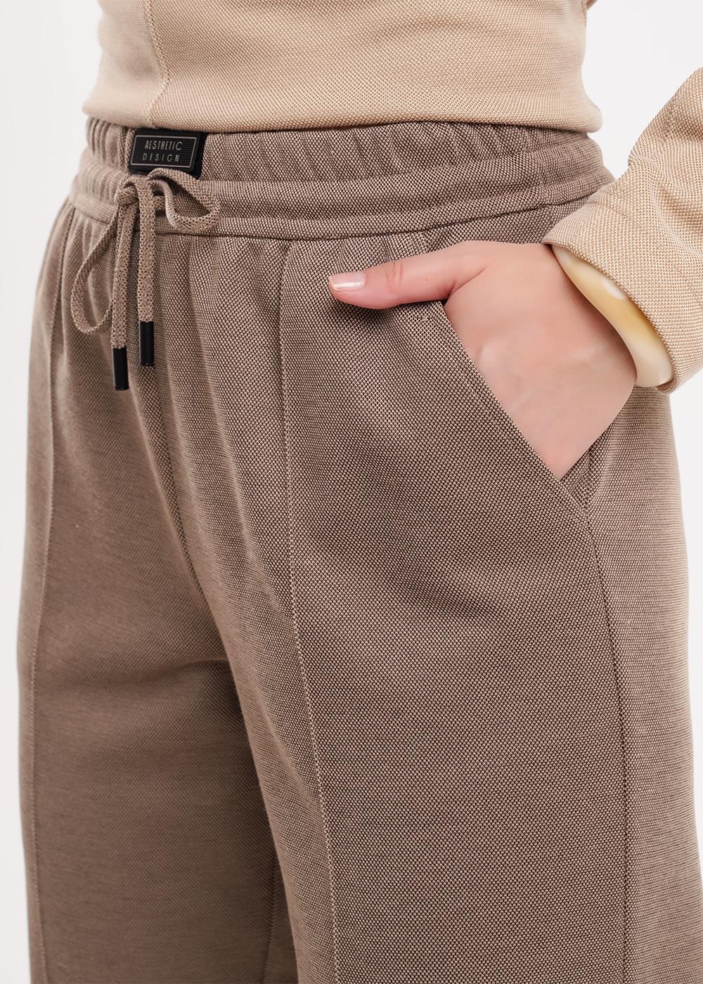 "Описание: Брюки зауженные из трикотажного полотна пике жаккард. По талии притачной пояс на внутренней резинке со шнуром из окантовки, спереди нашивка. Боковые карманы с отрезным бочком. По переду застроченные стрелки.