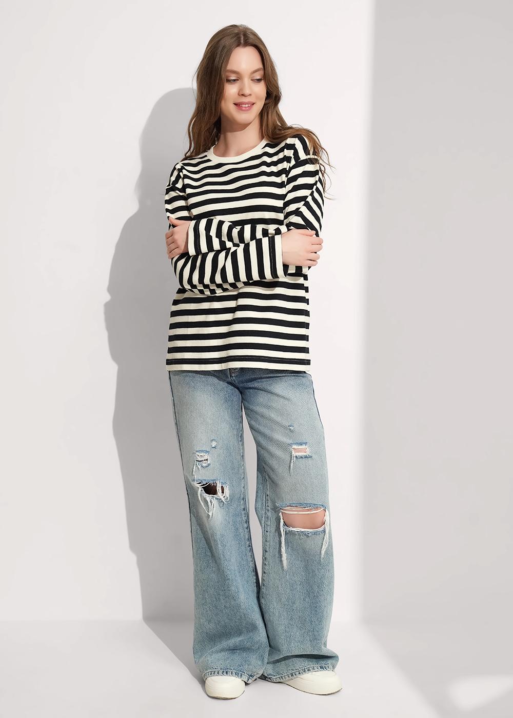 "Описание: Джемпер прямого свободного кроя из хлопкового трикотажного полотна. Длинный рукав со спущенной линией плеча. Округлая горловина с обтачкой из кашкорсе.