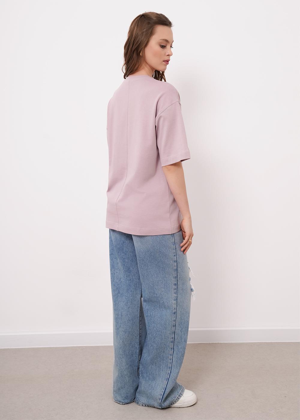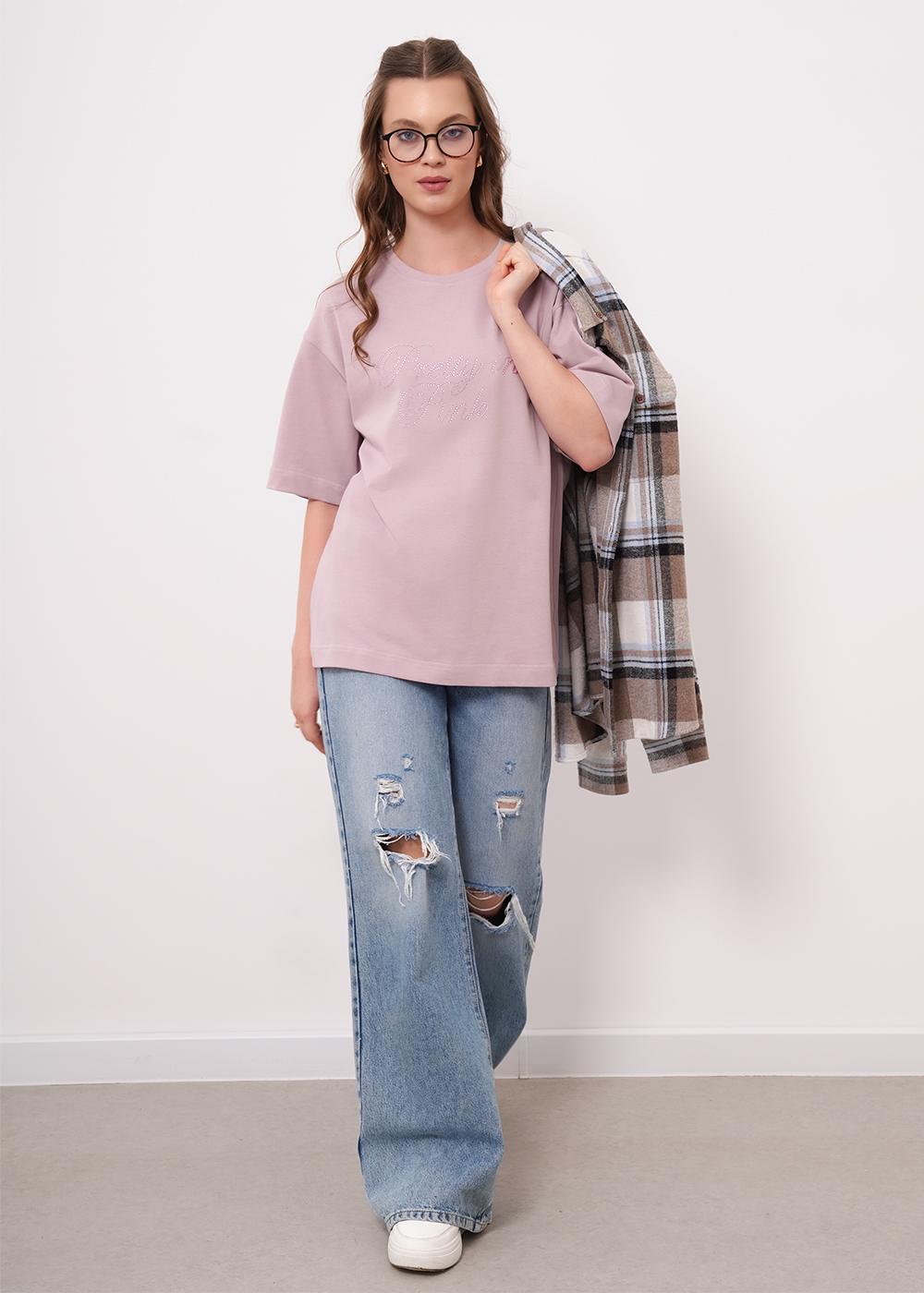 "Описание: Футболка оверсайз из хлопкового трикотажного полотна. Короткий спущенный рукав. Округлая горловина с обтачкой из рибаны. По спинке средний шов. По переду термостразы.