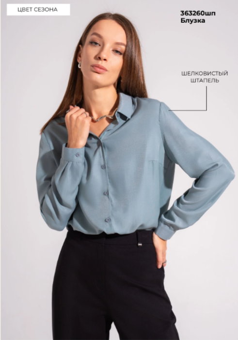 "Описание: Блузка среднего объема из текстильного полотна штапель. Отложной воротник со стойкой. Цельнокроеная планка с застежкой на пуговицы. Втачной рукав, внизу притачной манжет с застежкой на пуговицу. Низ прямой, по бокам разрезы.