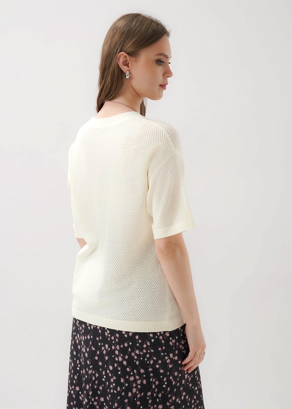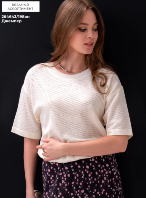 "Описание: Вязаный джемпер прямого силуэта из вискозной пряжи с добавлением нейлона, ажурного переплетения. Короткий втачной рукав. Округлая горловина с бейкой. По низу изделия и рукава сдвоенная гладь.