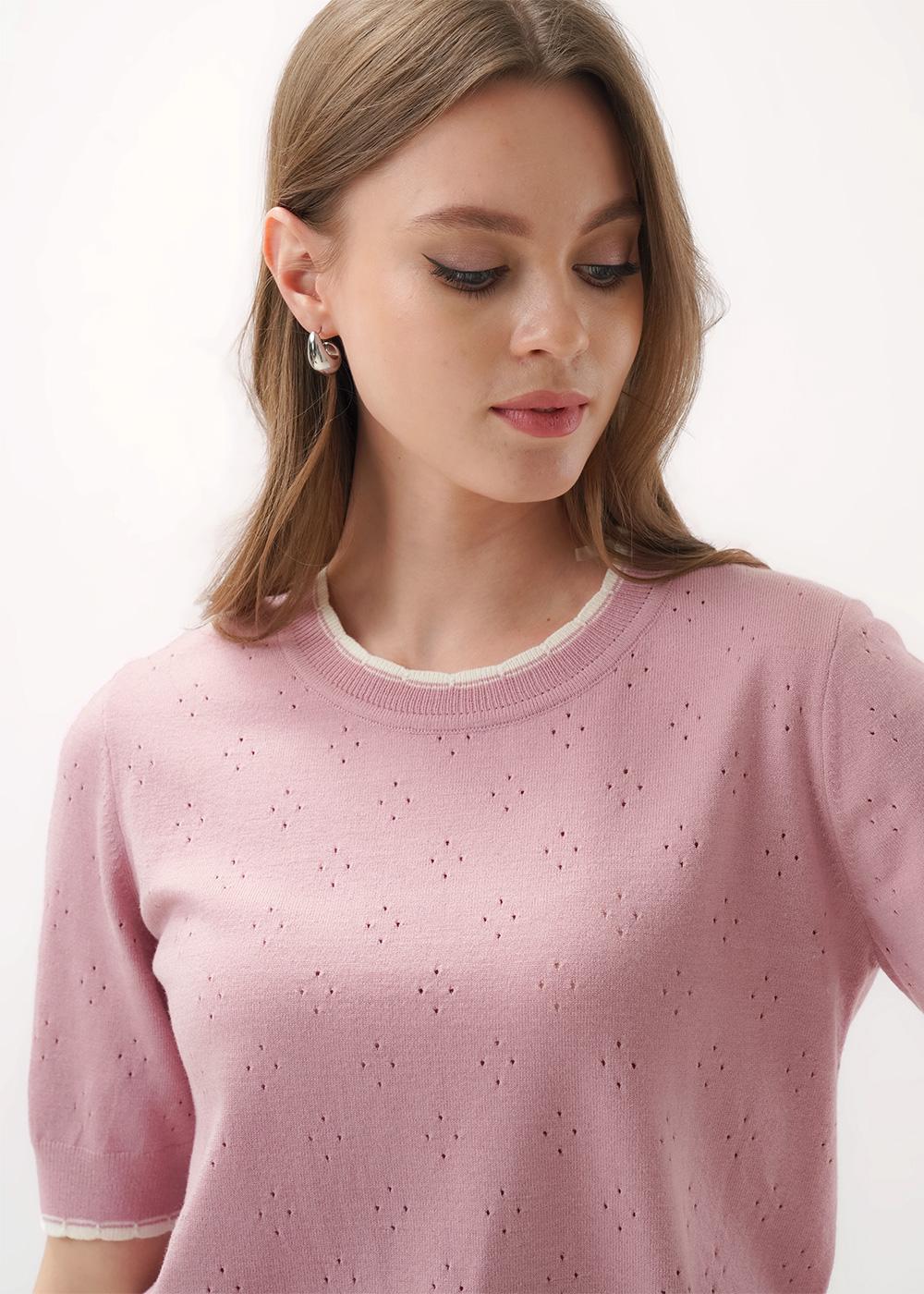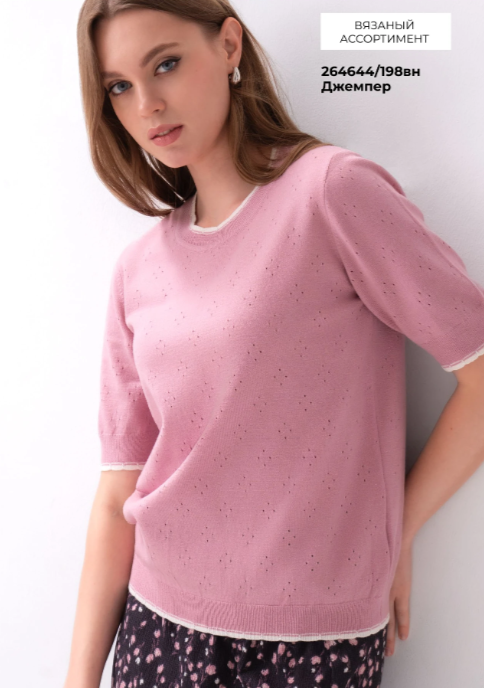 "Описание: Вязаный джемпер прямого силуэта из вискозной пряжи с добавлением нейлона, ажурного переплетения. Короткий втачной рукав. Округлая горловина с бейкой. По низу изделия и рукава манжет. По горловине, низу рукава и изделия контрастные фестоны.
