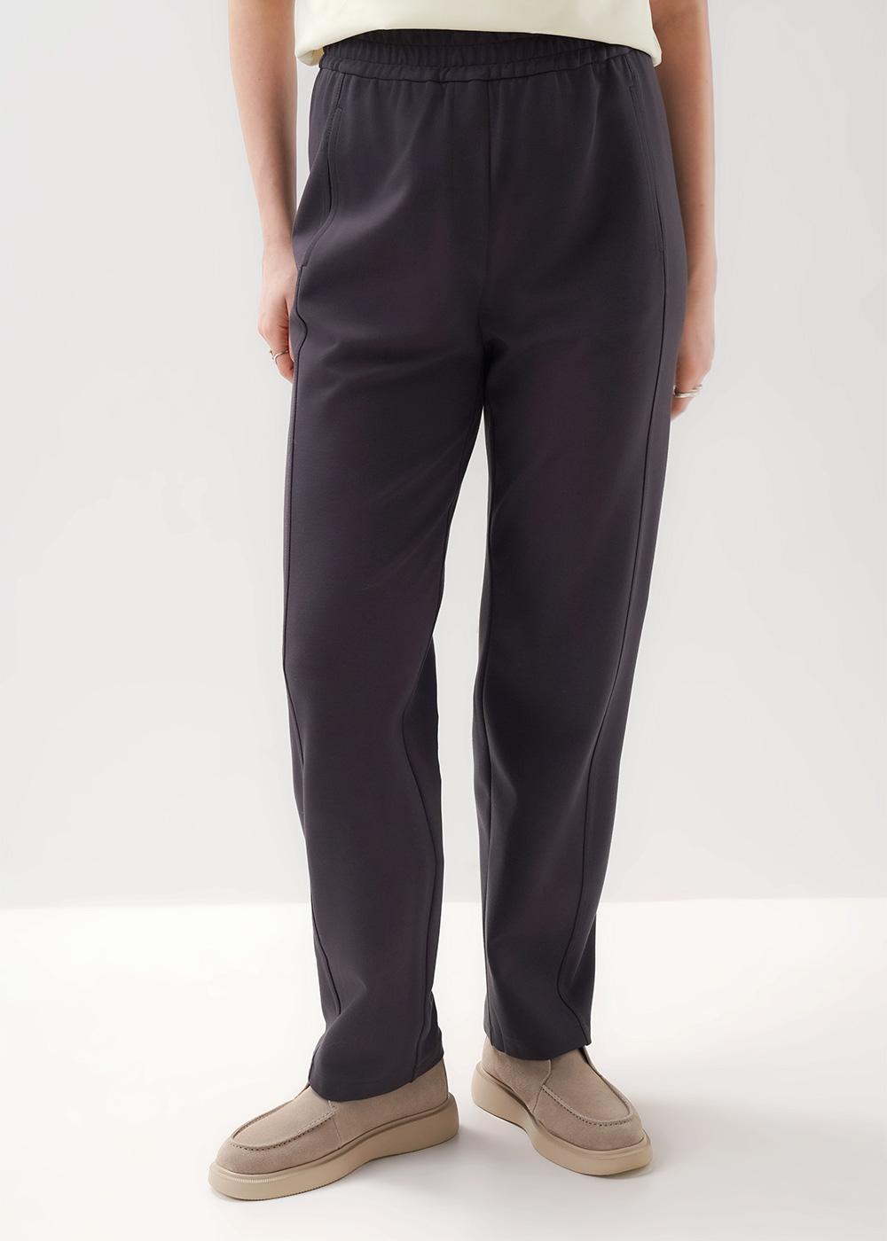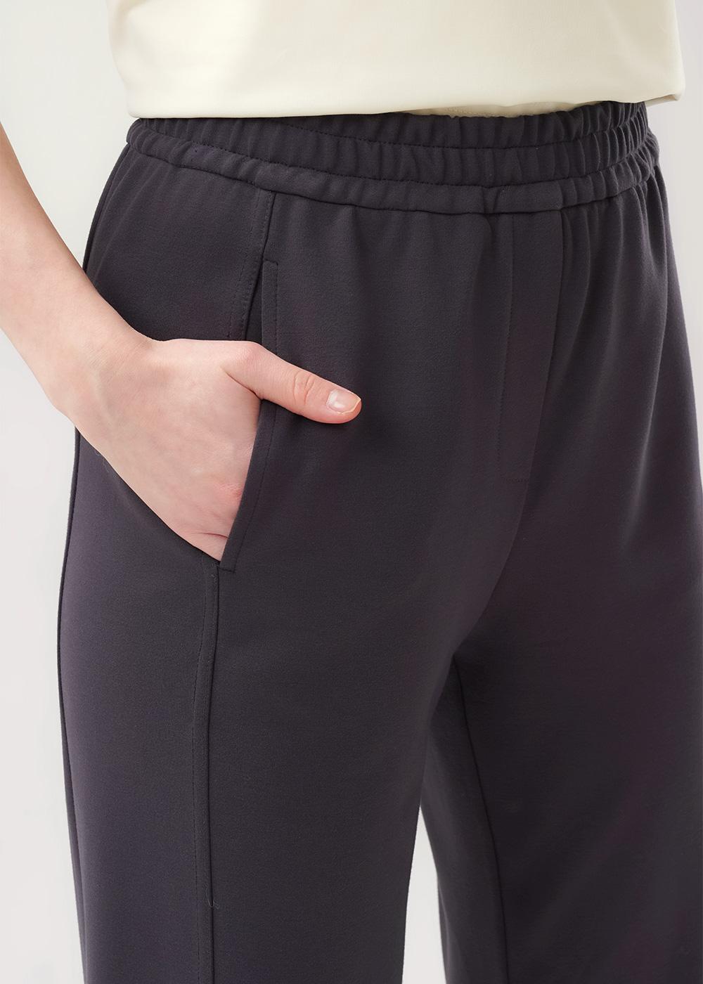"Описание: Брюки зауженные из трикотажного полотна дабл фейс. По талии притачной пояс с внутренней резинкой. Спереди имитация гульфика. По переду застроченный резы, боковые карманы в шве.