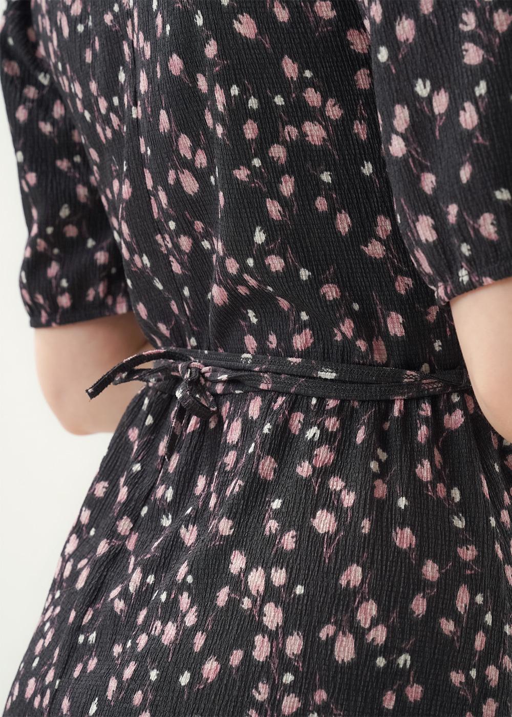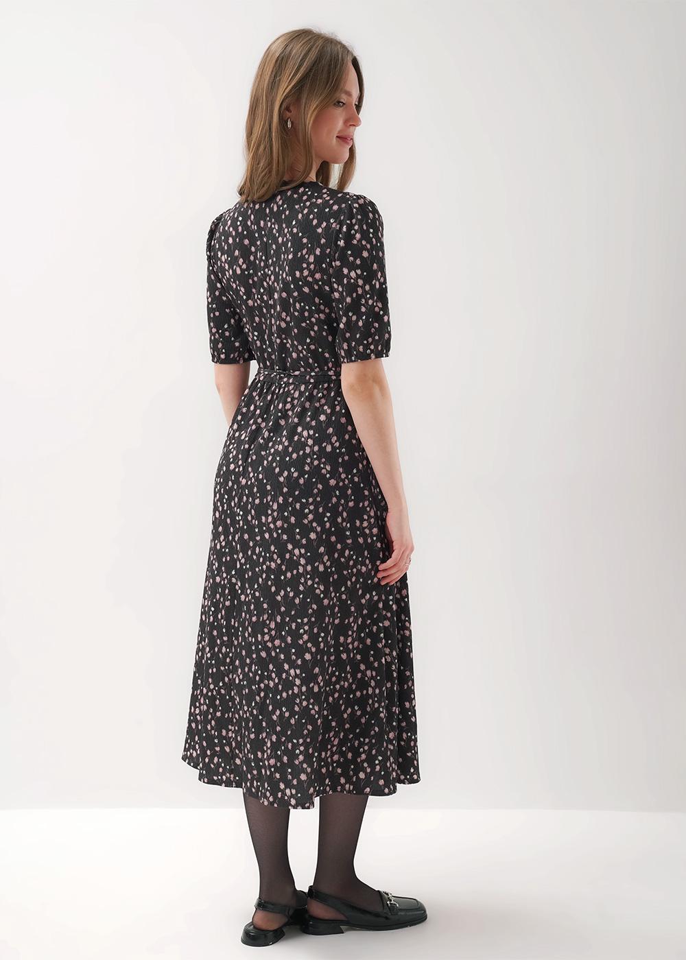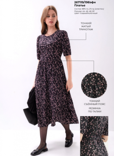 "Описание: Платье отрезное по талии из фатурного трикотажного полотна джерси, юбка присборена. Втачной короткий рукав фонарик, резинка по низу. Горловина с внутренней бейкой. По переду и спинке средний шов, спереди складки. По талии съёмный узкий пояс из окантовки.