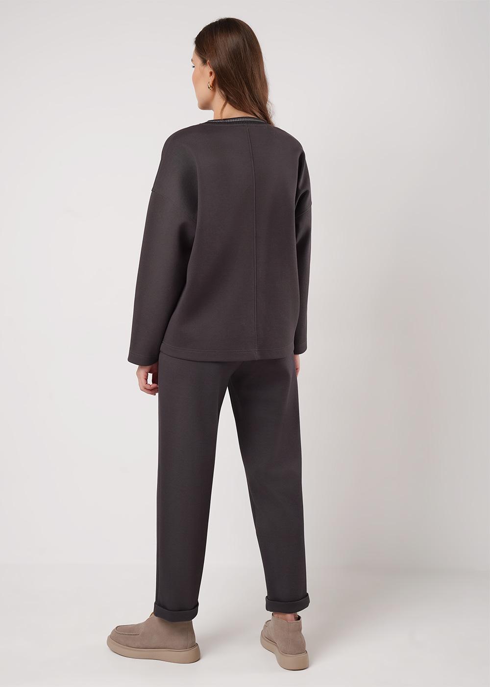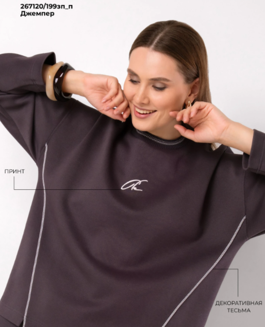 "Описание: Джемпер свободного объема из трикотажного полотна плотное пике. Округлая горловина с вязаной обтачкой. Длинный рукав со спущенной линией плеча. По переду рельефы с декоративной тесьмой люрекс, внизу разрезы. По спинке средний шов. Спереди принт.