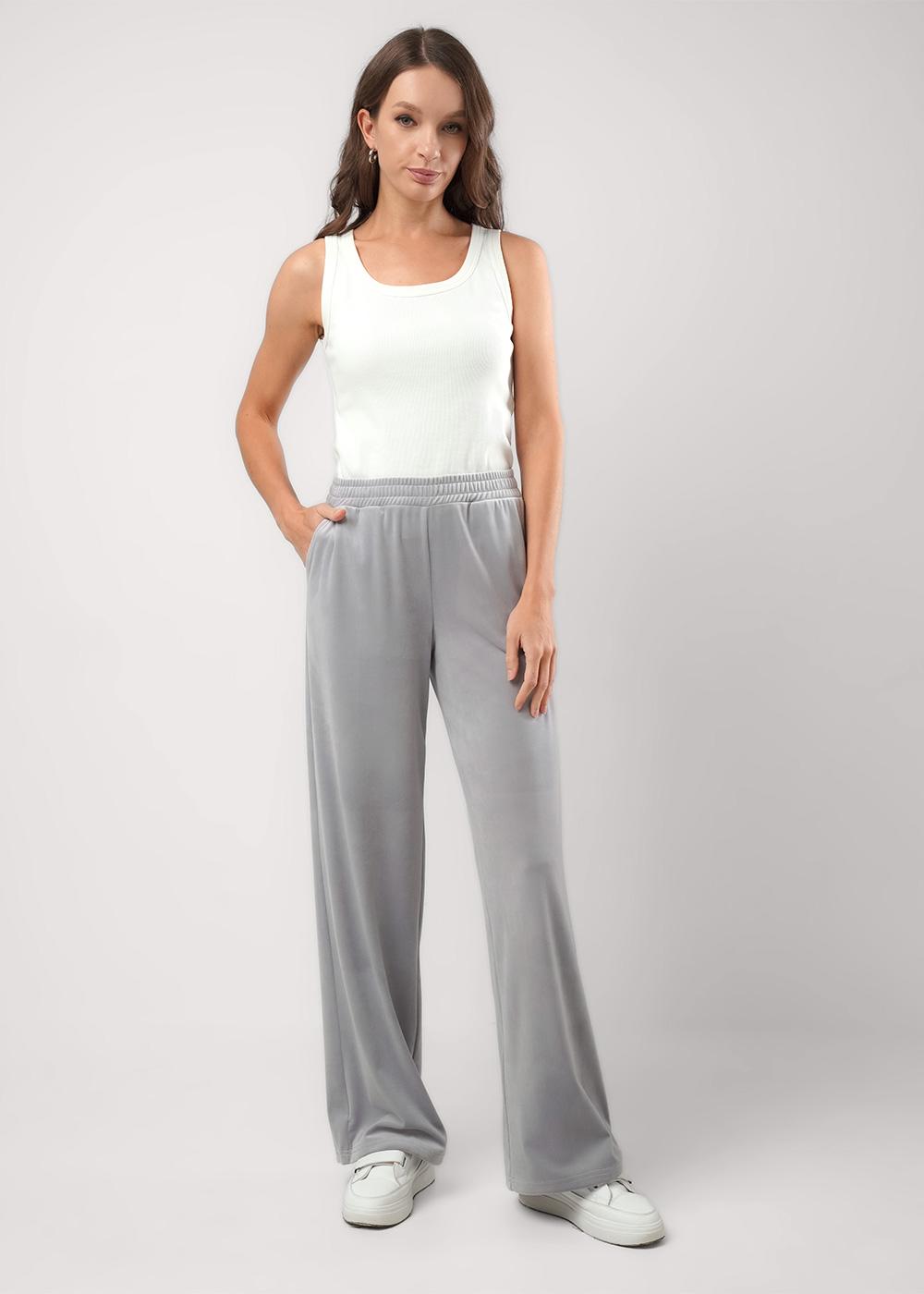 "Описание: Брюки широкие из трикотажного полотна велюр. По талии притачной пояс на внутренней резинке. Боковые карманы с отрезным бочком. По низу брюк кулиса со шляпной резинкой и стопором.