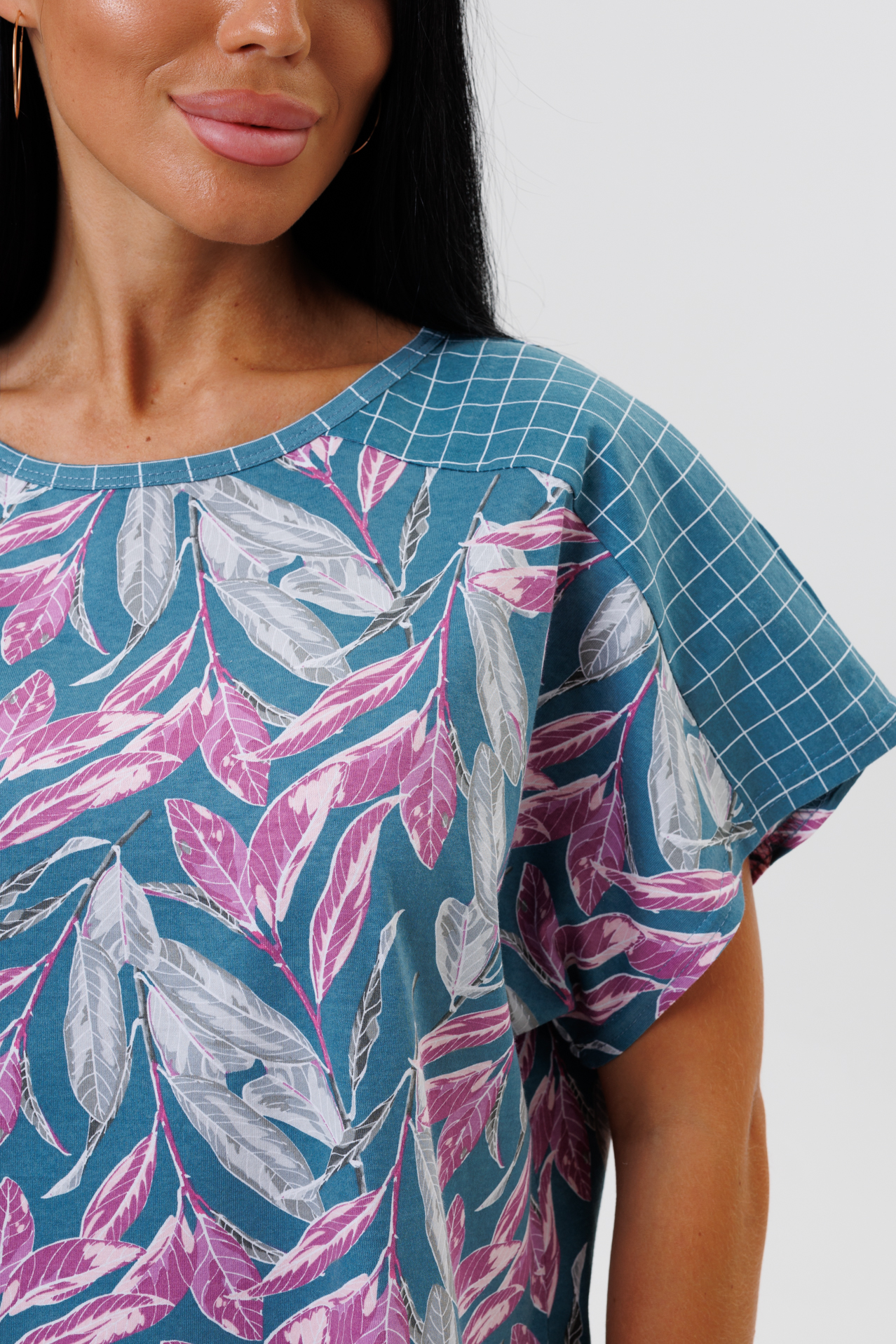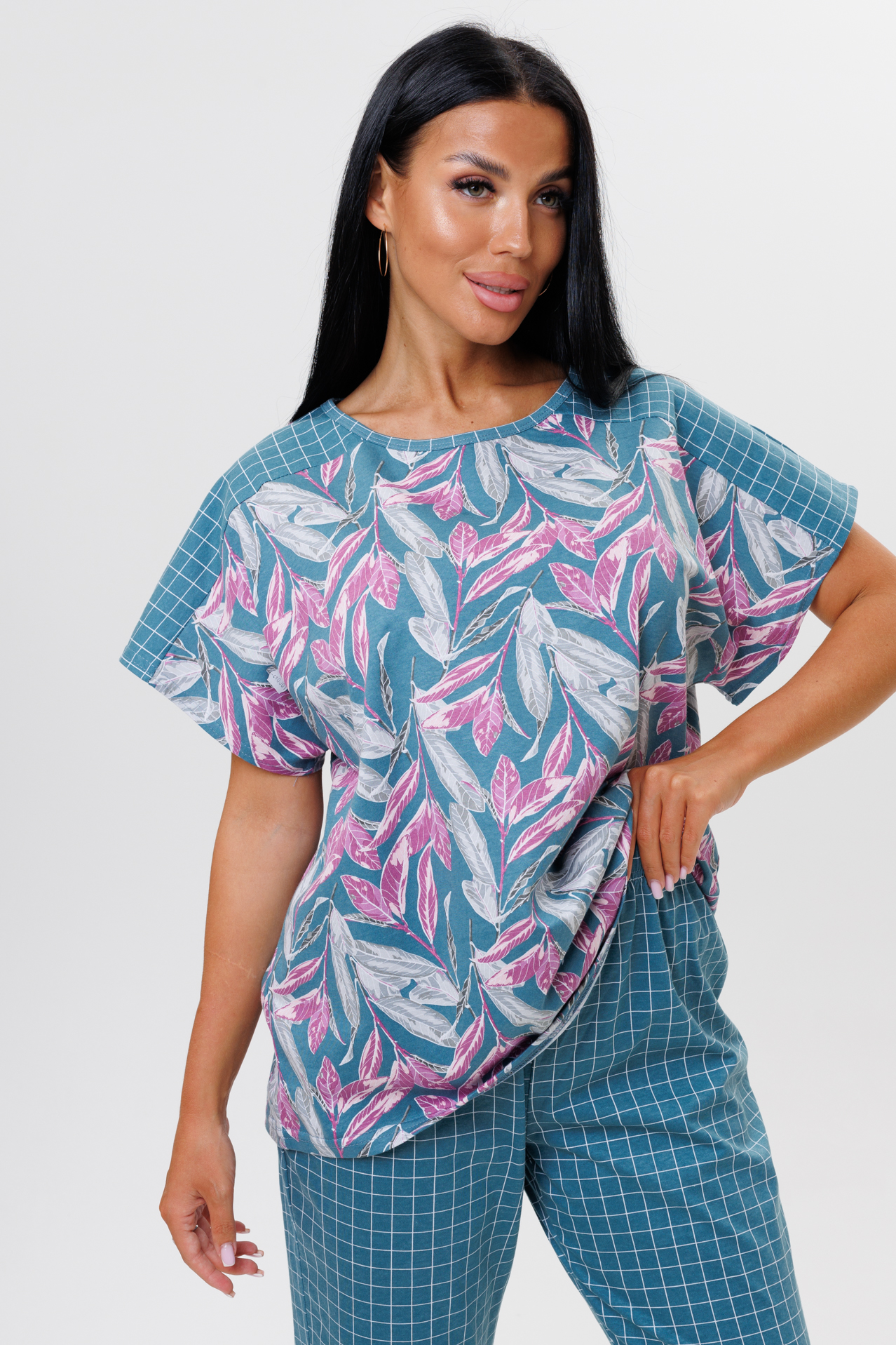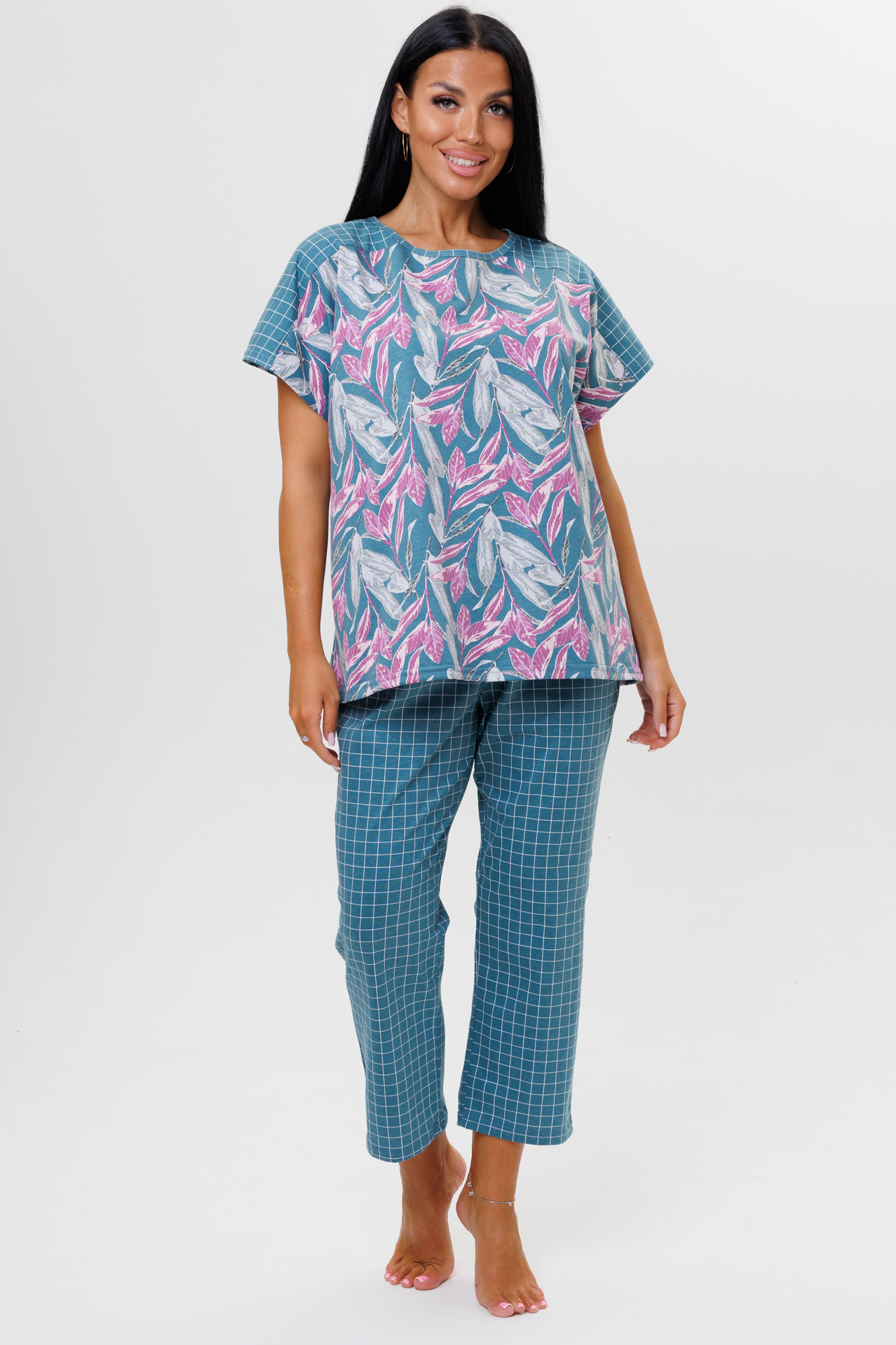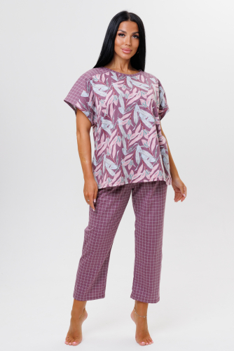 Костюм состоит из футболки и брюк. Футболка с круглым вырезом, короткими спущенными рукавами, декорированные тканью компаньоном. Брюки укорочены чуть выше щиколотки на широкой резинке сшиты из ткани компаньона.