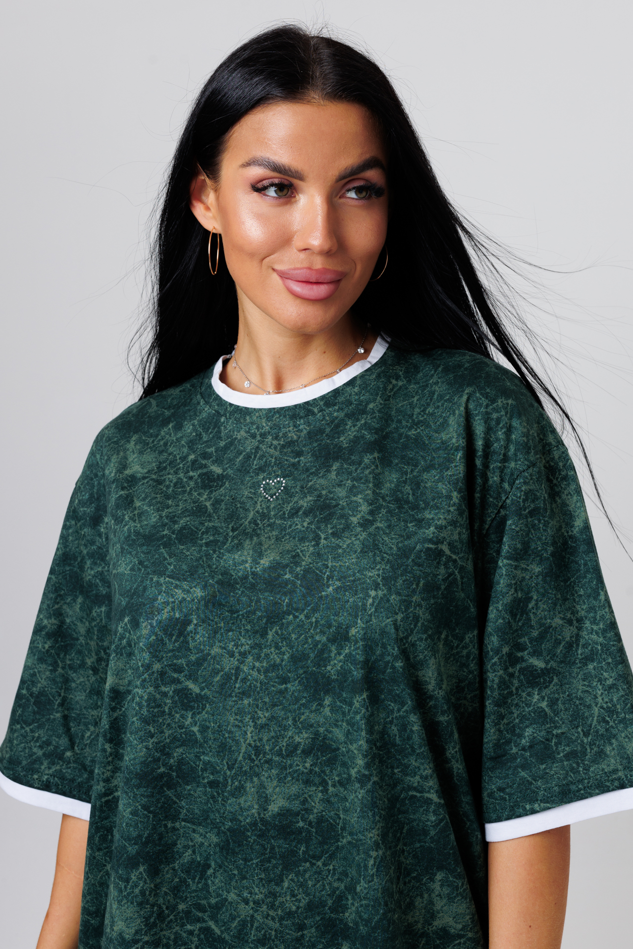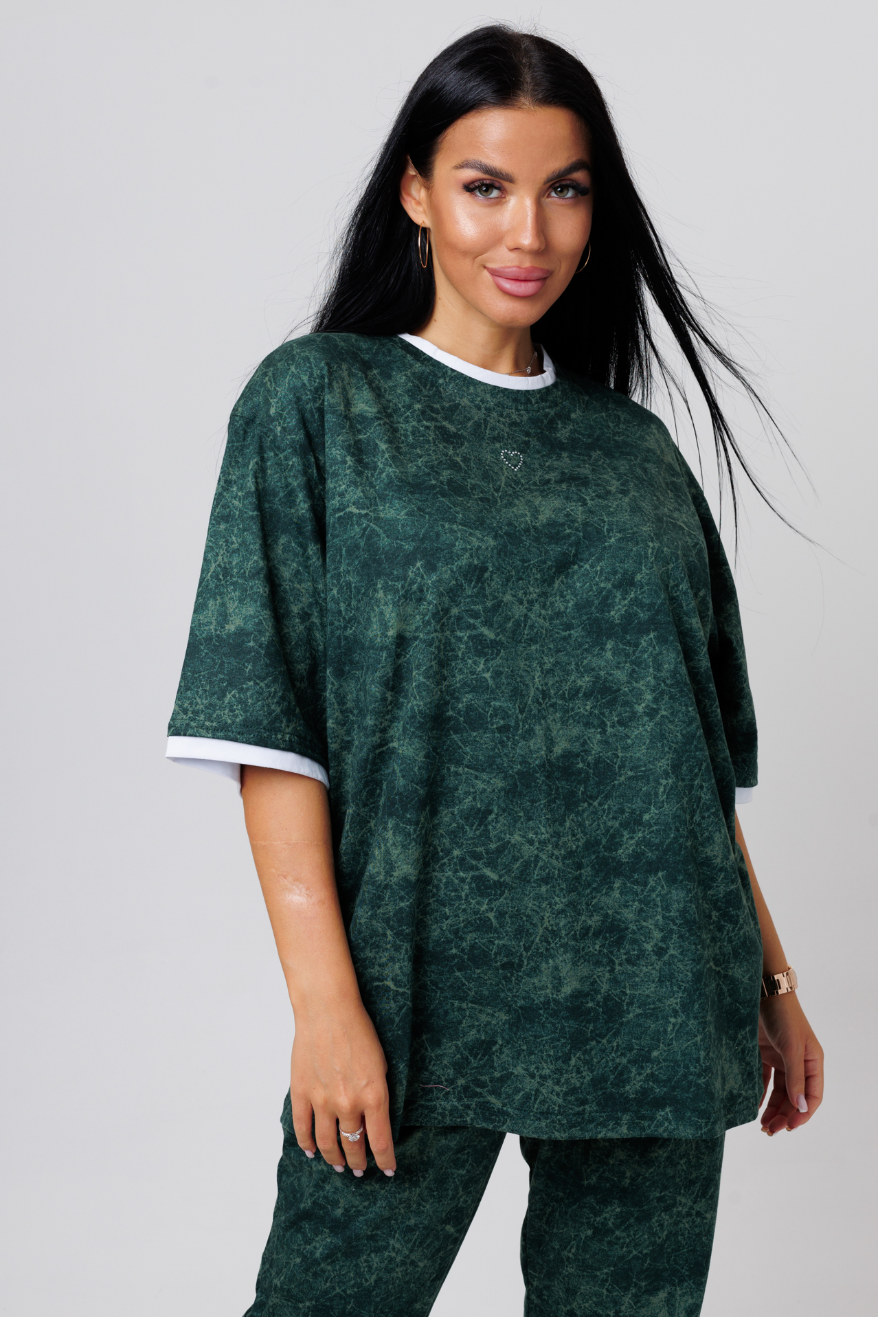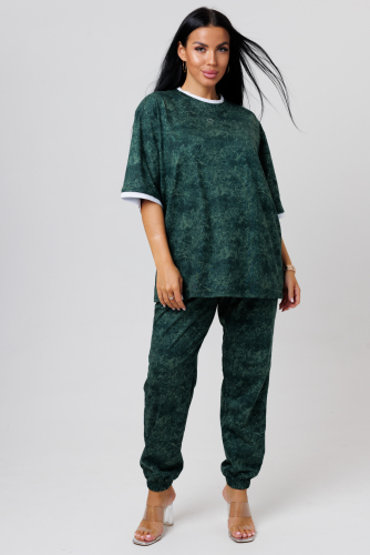Новинка - модный, красивый костюм в стиле оверсайз с принтом и эффектом варенки, состоит из футболки и брюк свободного силуэта. Спущенный рукав. Двойная обтачка горловины, отделка на рукавах. На груди аппликация из страз, придает образу изюминку. Брюки в спортивном стиле на резинке, с карманами.