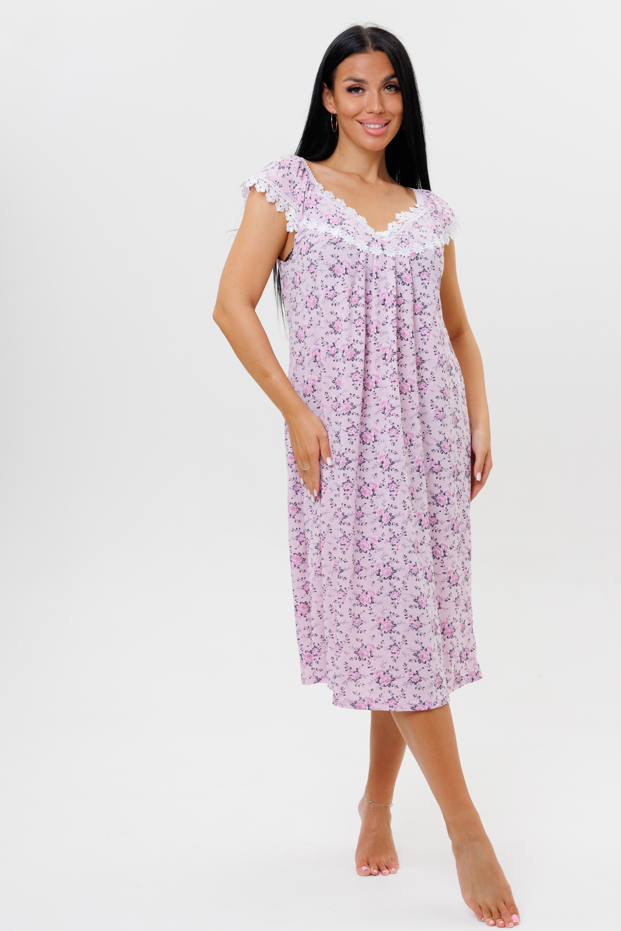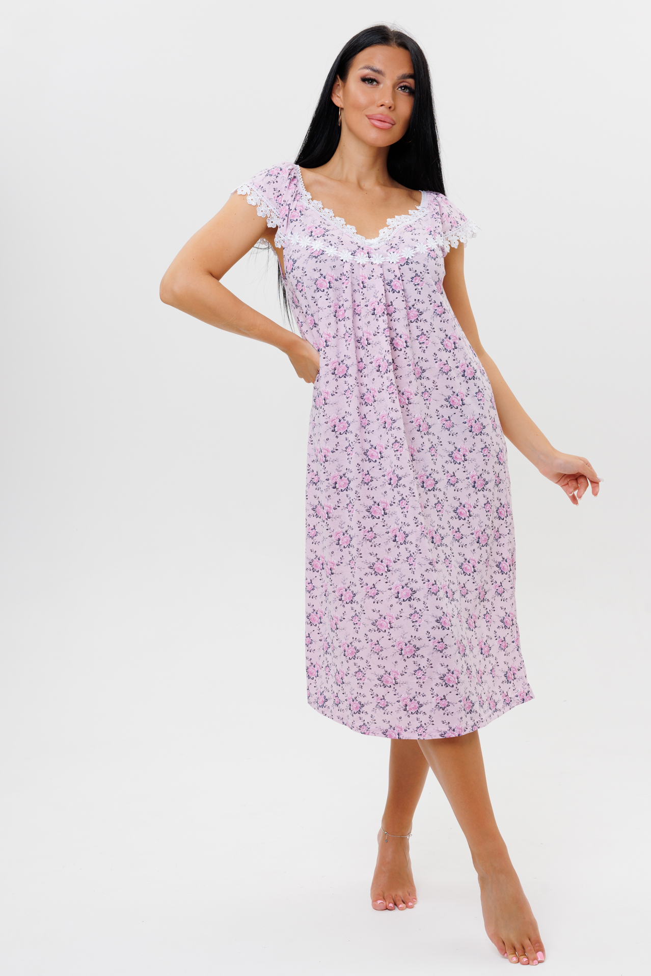 Оригинальная ночная сорочка выполнена из кулирки. Женственность этой сорочке придает вырез декольте, кокетка на груди со складками, отделанные кружевом.