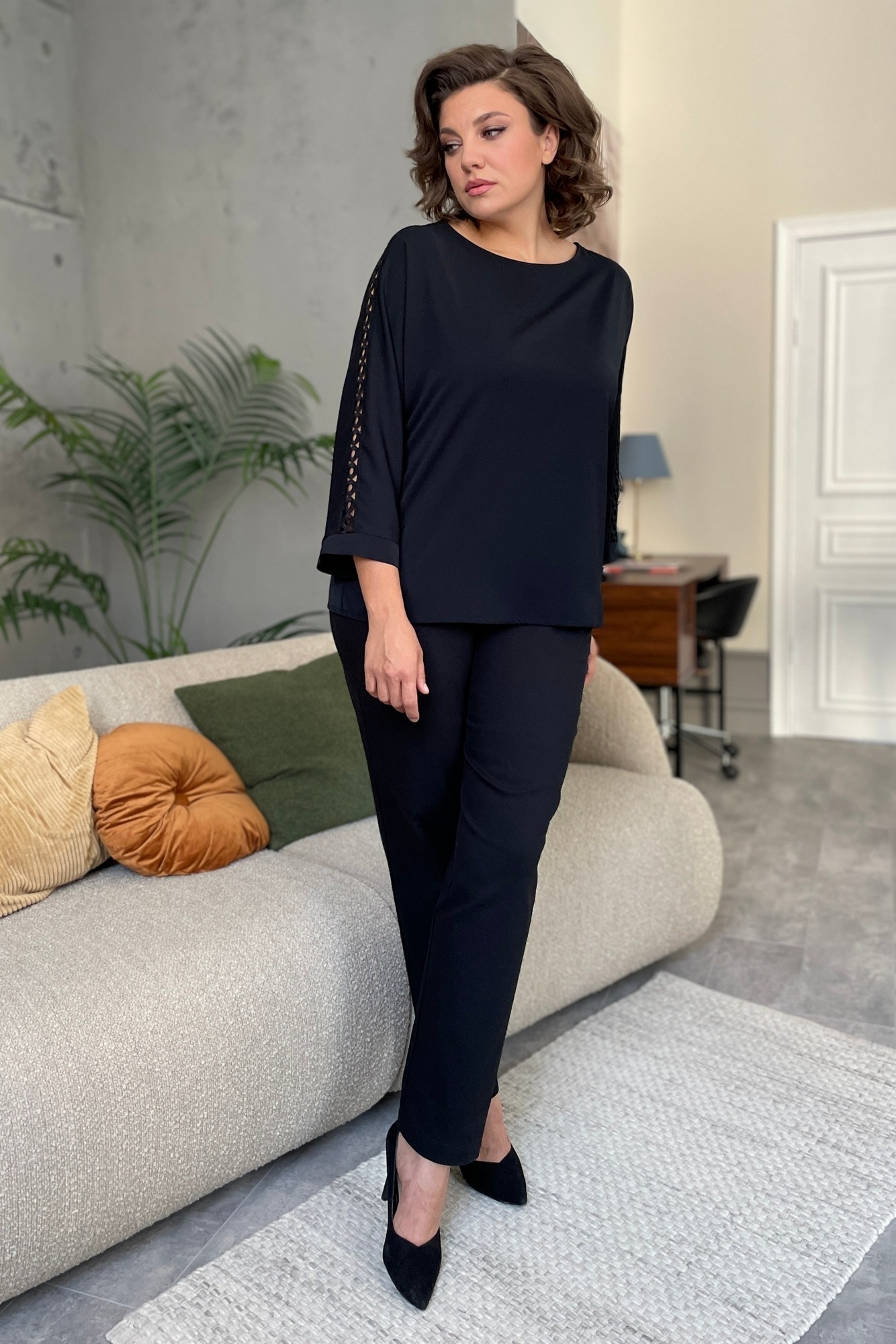 "Блуза женская из текстильной ткани. Прямого силуэта. По спинке расположен подрез. В шов вставлено кружево. Рукав спущенный с манжетой. По плечевому шву вставлено кружево. Вырез лодочка. Обработан притачной бейкой.