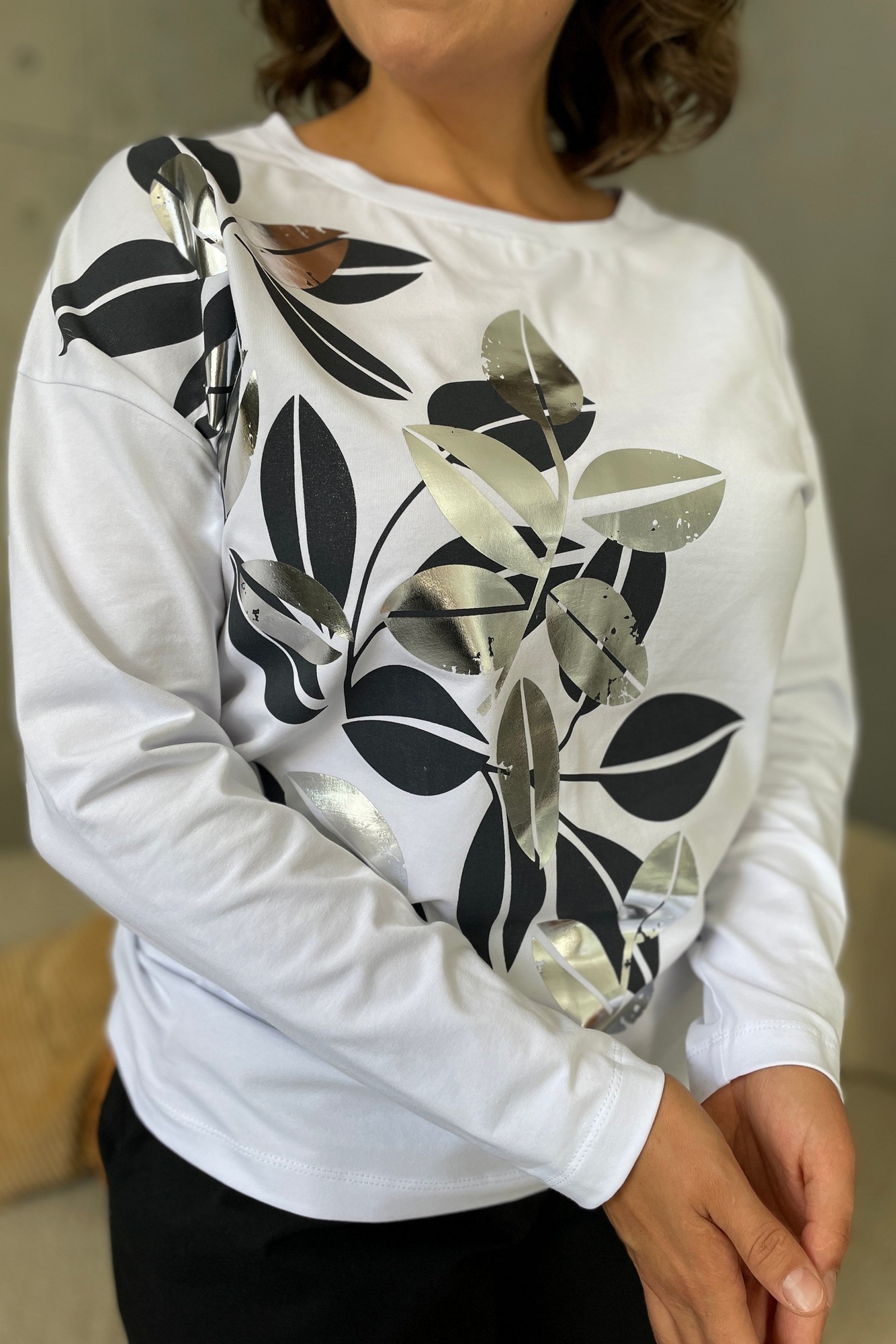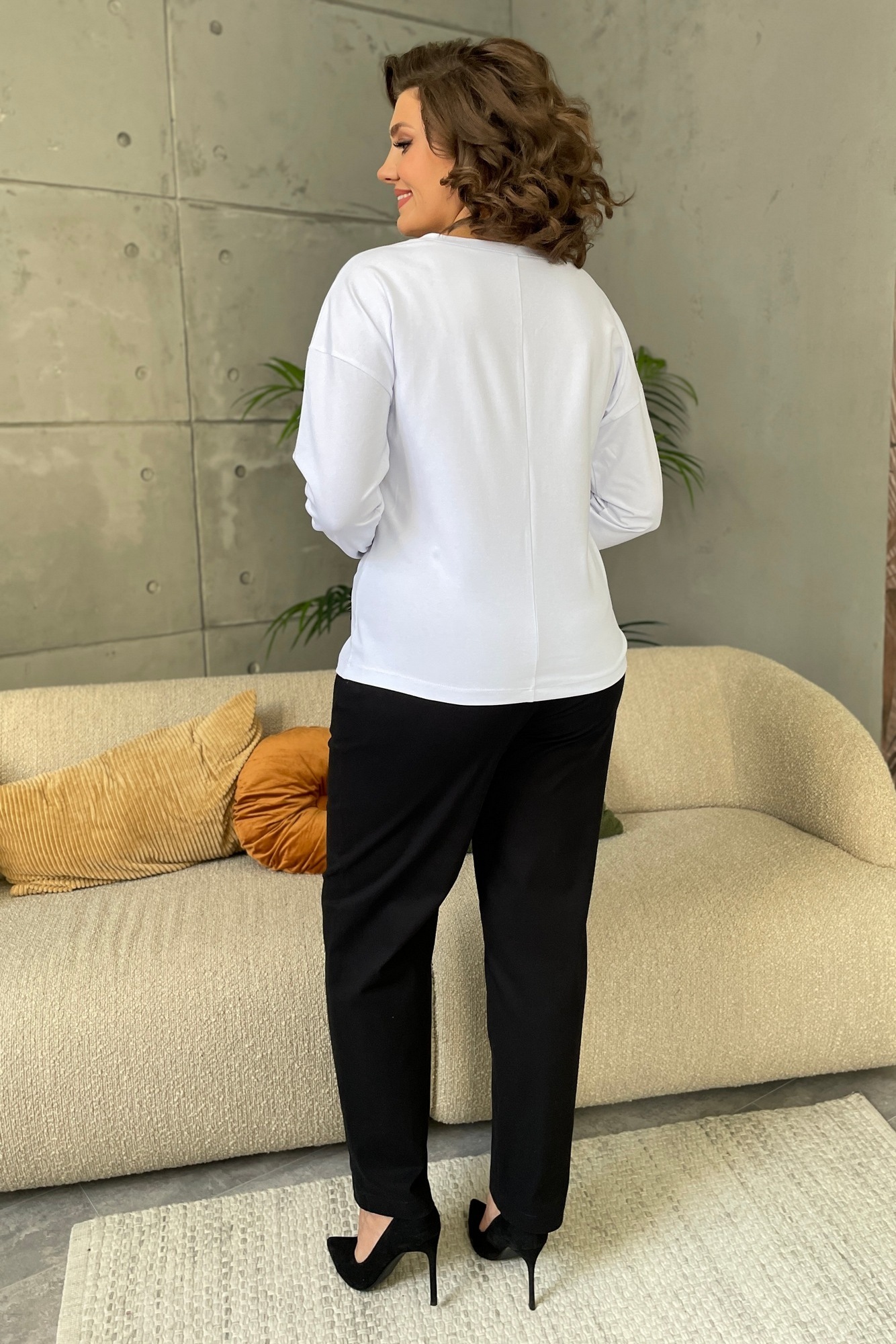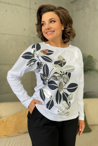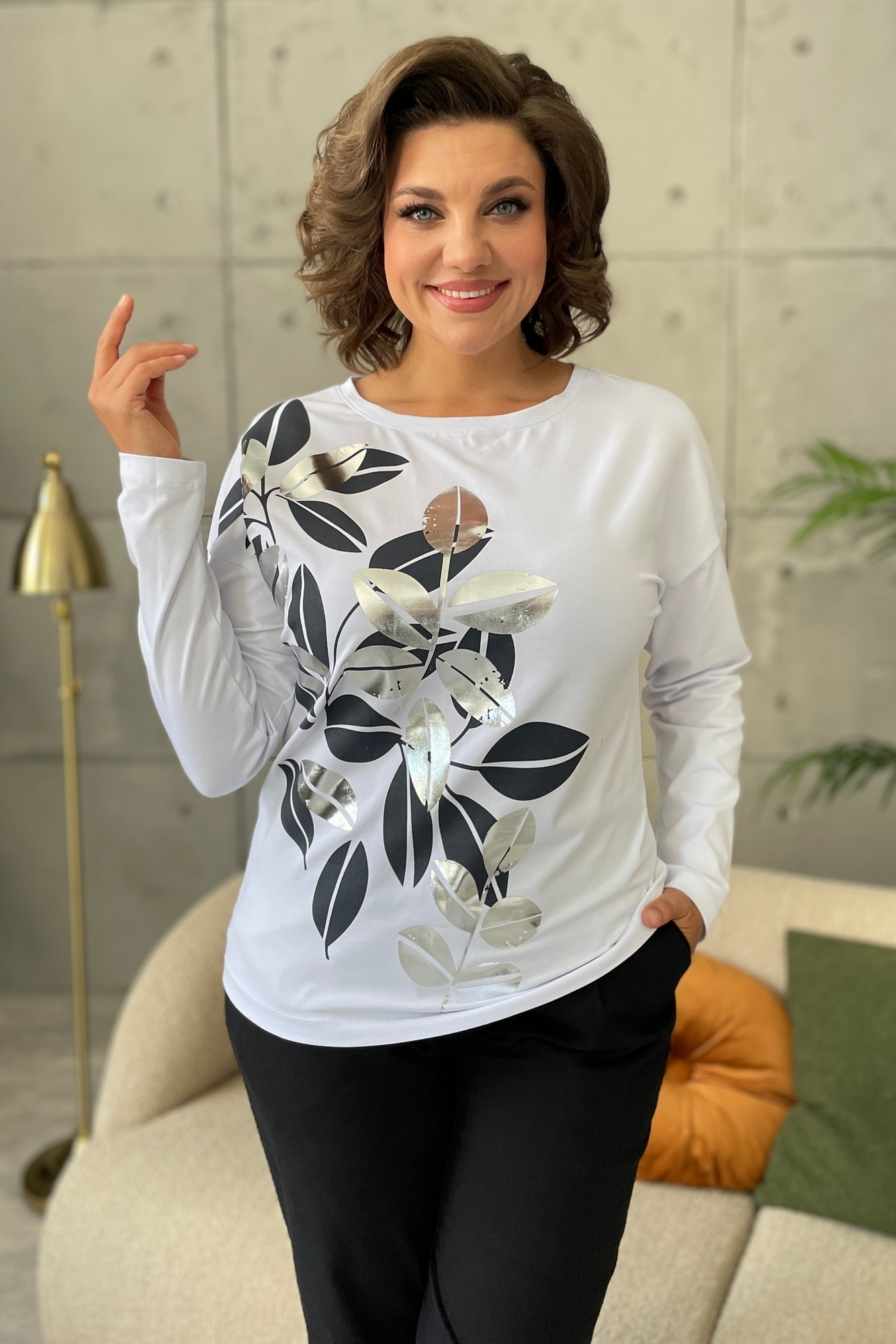 "Джемпер из хлопковой трикотажной ткани. По переду расположен принт. Спинка со средним швом. Рукав одношовный, спущенный. Вырез горловины-круглый, обработан бейкой.