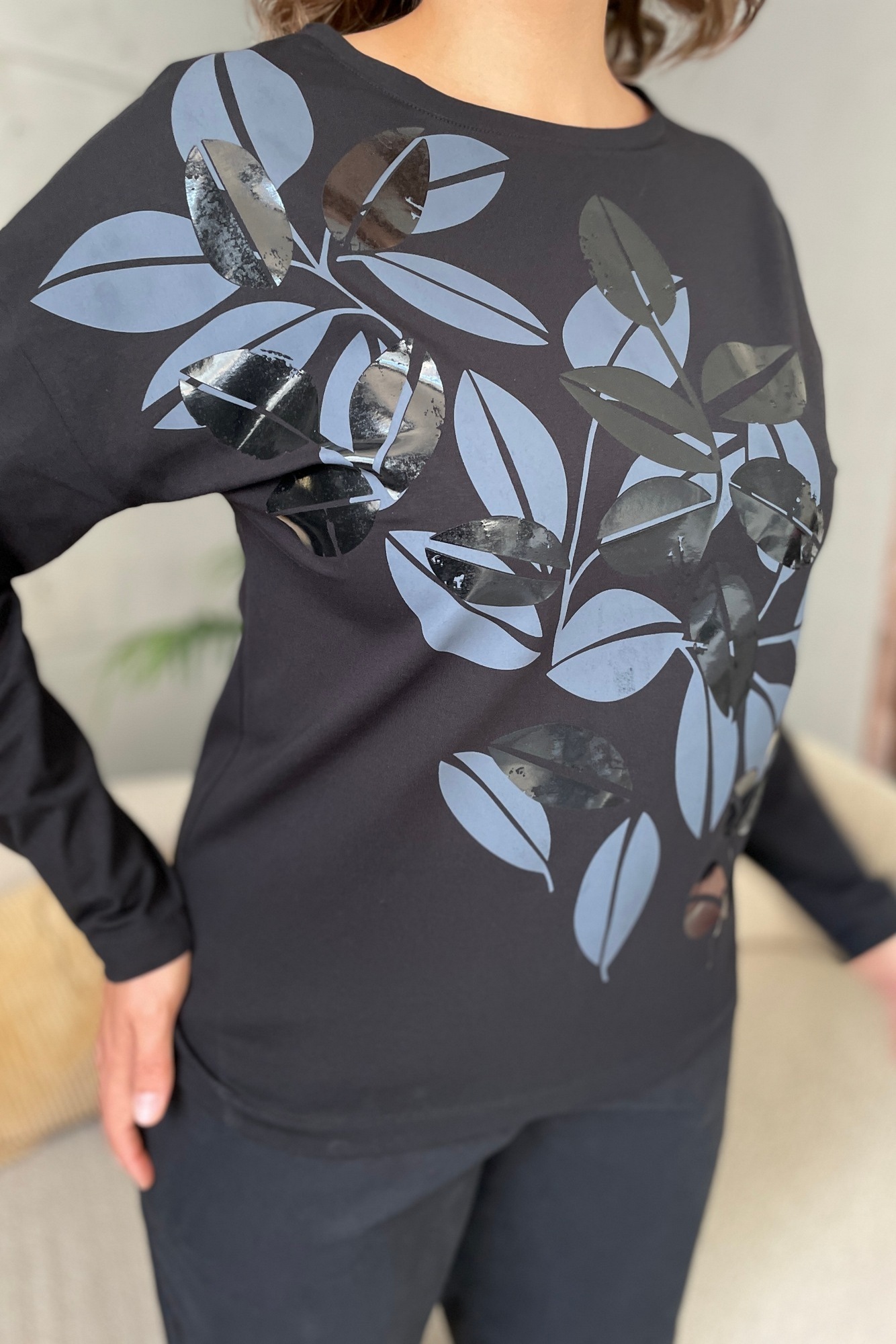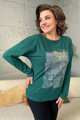 "Джемпер из хлопковой трикотажной ткани. По переду расположен принт. Спинка со средним швом. Рукав одношовный, спущенный. Вырез горловины-круглый, обработан бейкой.