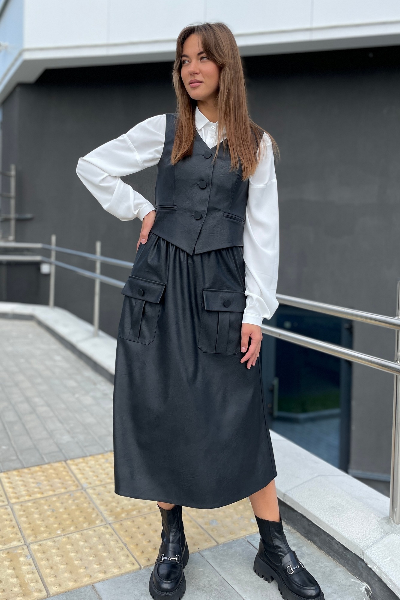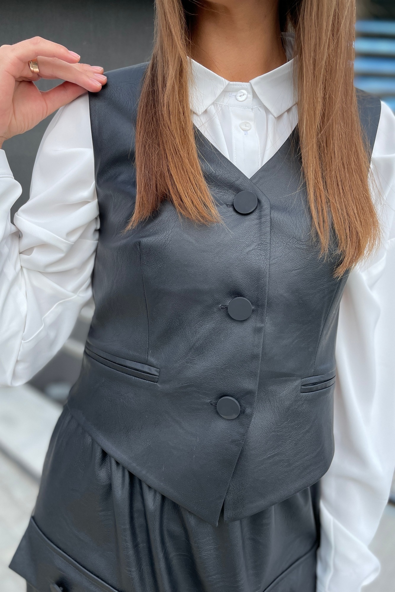 "Жилетка женская из эко-кожи. По переду жилетки расположены карманы в рамку. Спинка со средним швом и талиевыми вытачками. Жилет на подкладке. Застежка на петлях-пуговицах. Низ жилетки фигурной формы. Перед длиннее спинки