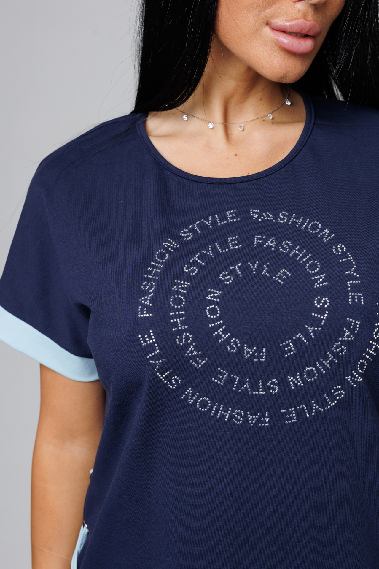 Костюм женский с бермудами идеальное решение для летнего гардероба. Костюм сшит из трикотажного полотна кулирки с лайкрой, которая придает ему дополнительную мягкость и удобство в носке. Комплект подходит как для повседневной носки, так и для отдыха на даче. Футболка имеет округлый вырез, короткие цельнокроеные рукава, на груди футболки принт в виде мерцающих страз. Бриджи выполнены из ткани компаньона, по линии талии мягкая эластичная резинка.