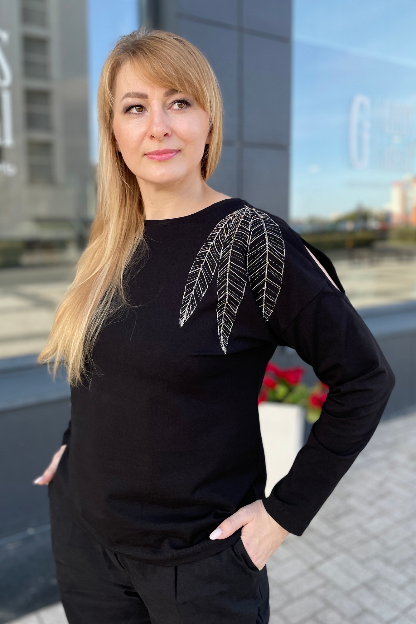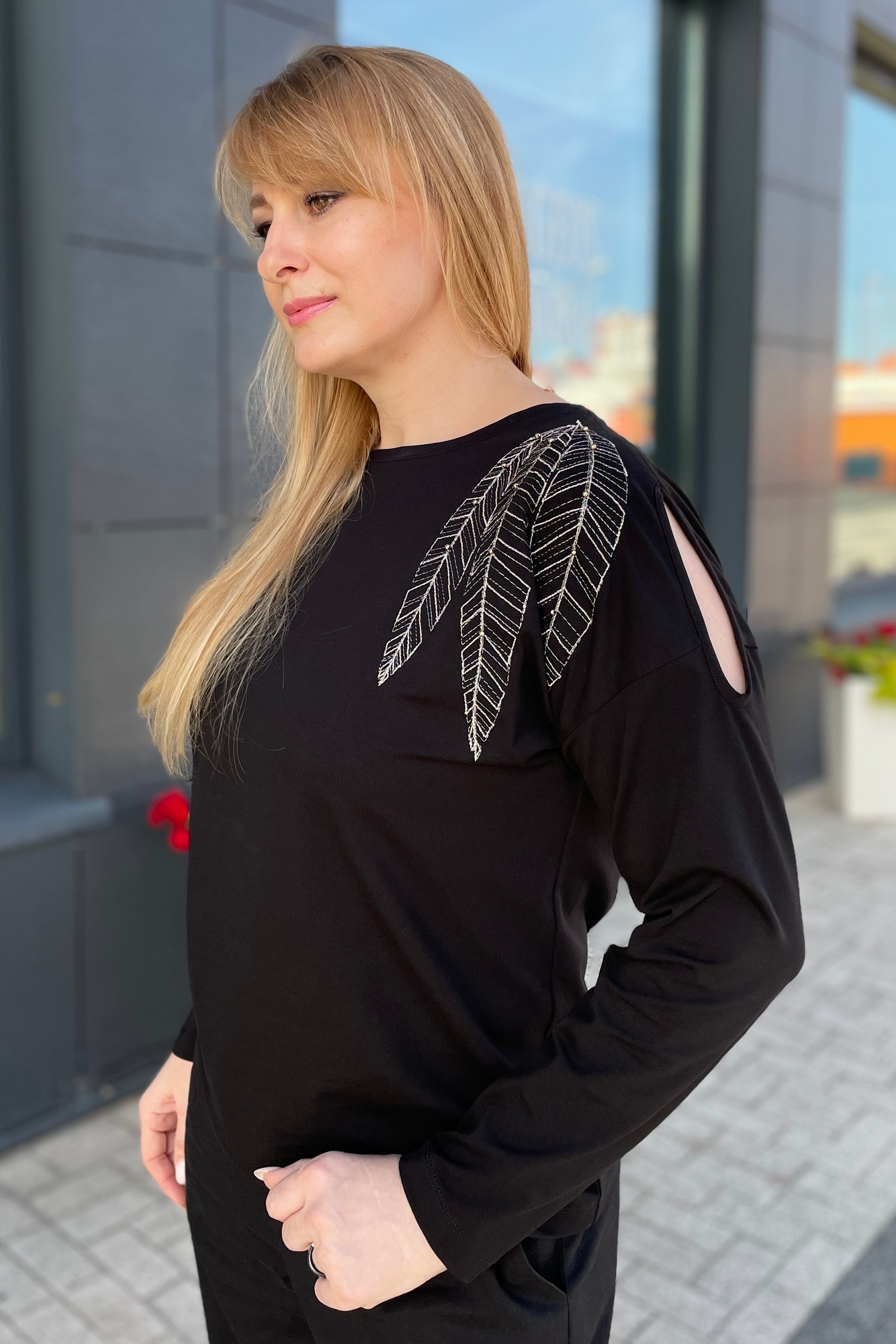 "Джемпер женский из трикотажной ткани. По переду джемпера от плечевого шва расположена вышивка. Вышивка украшена пришивными бусинами. По левому плечевому шву расположен вырез, обработанный окантовкой. Спинка со средним швом. Спущенное плечо.