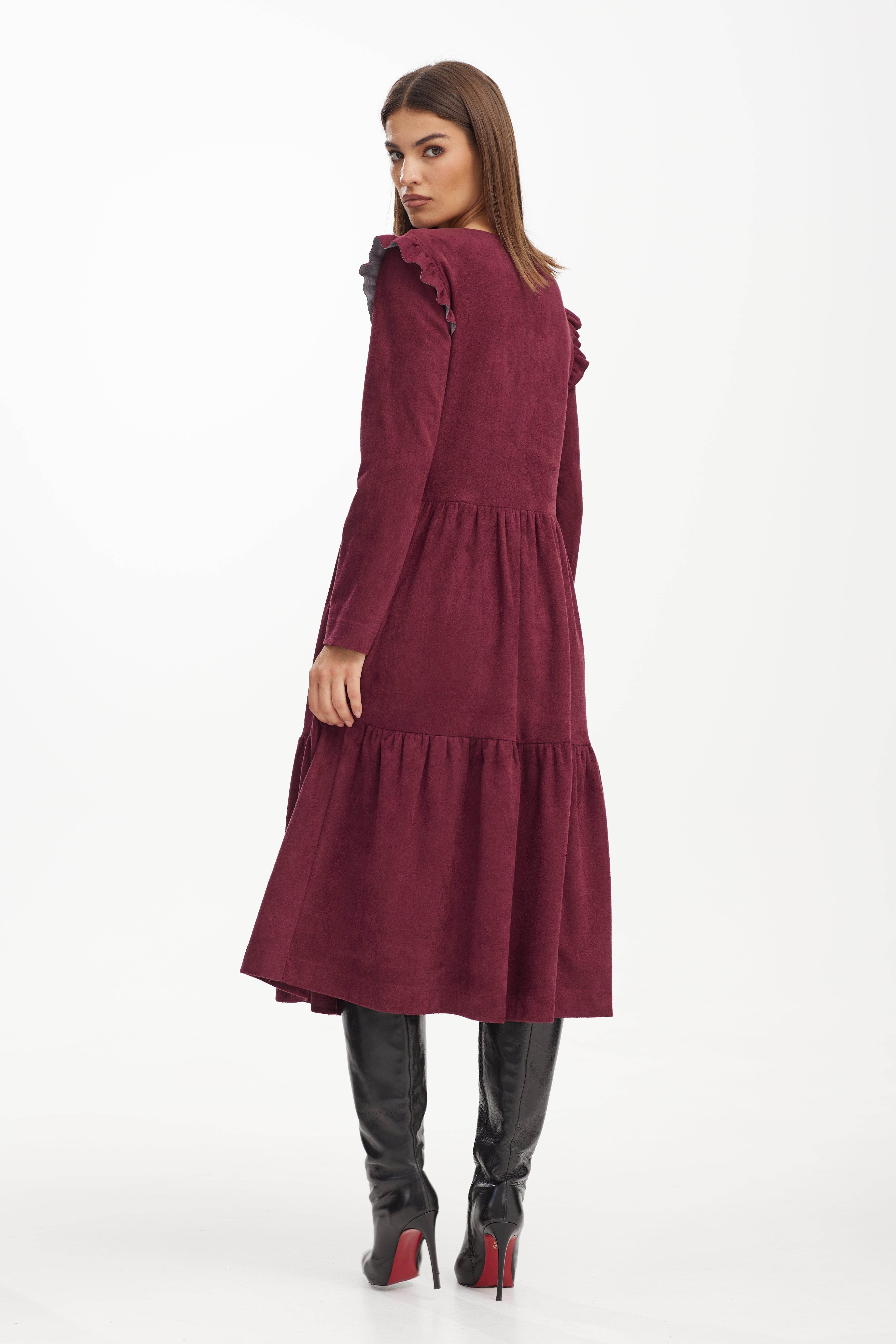 Платье 42-52 4750 Изящное модное платье из замшевого трикотажного полотна.. Модель свободной формы полуприлегающего силуэта расширенное к низу. Платье отрезное чуть выше линии талии с двумя ярусами воланов.Перед платья декорирован дизайнерской вышивкой .