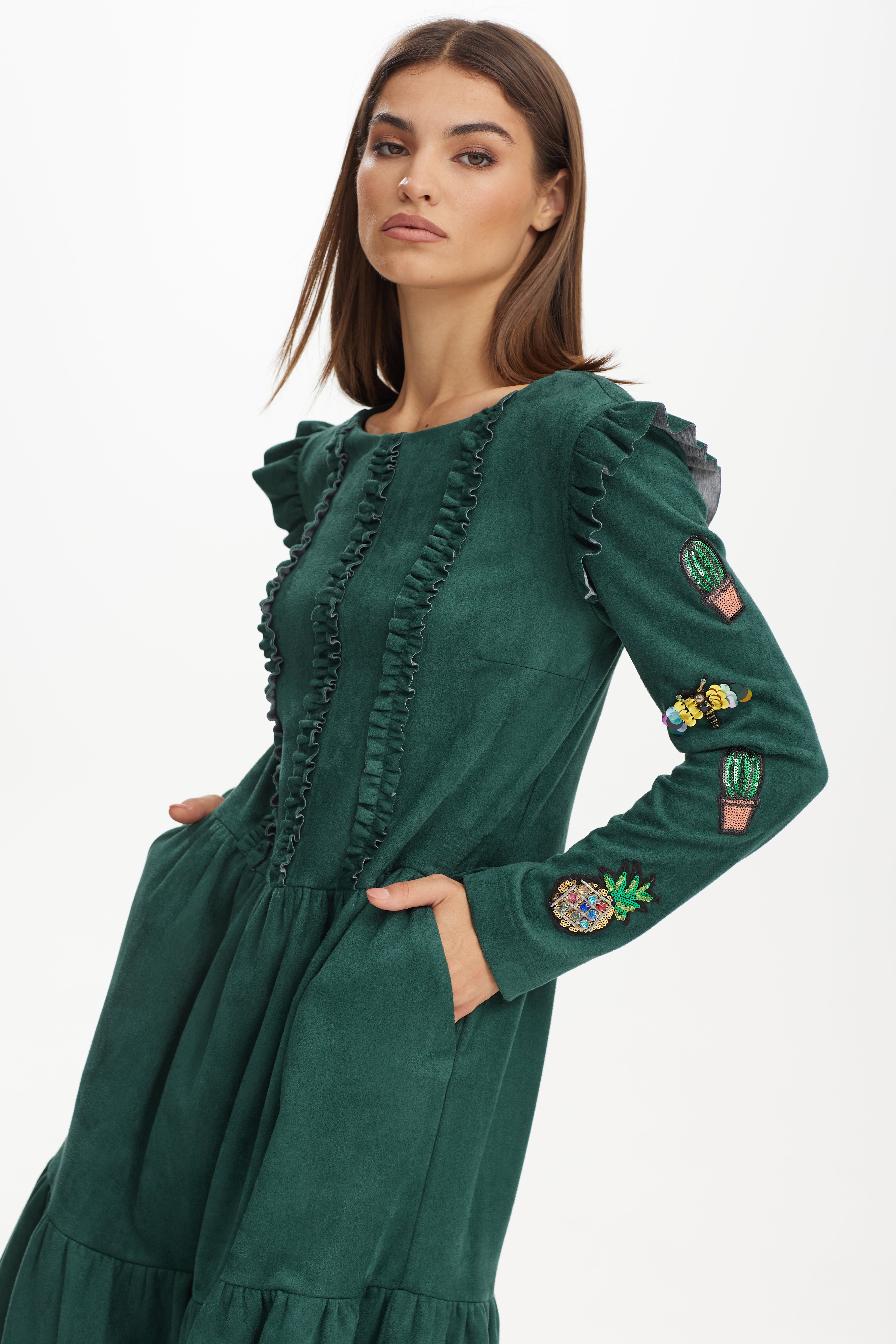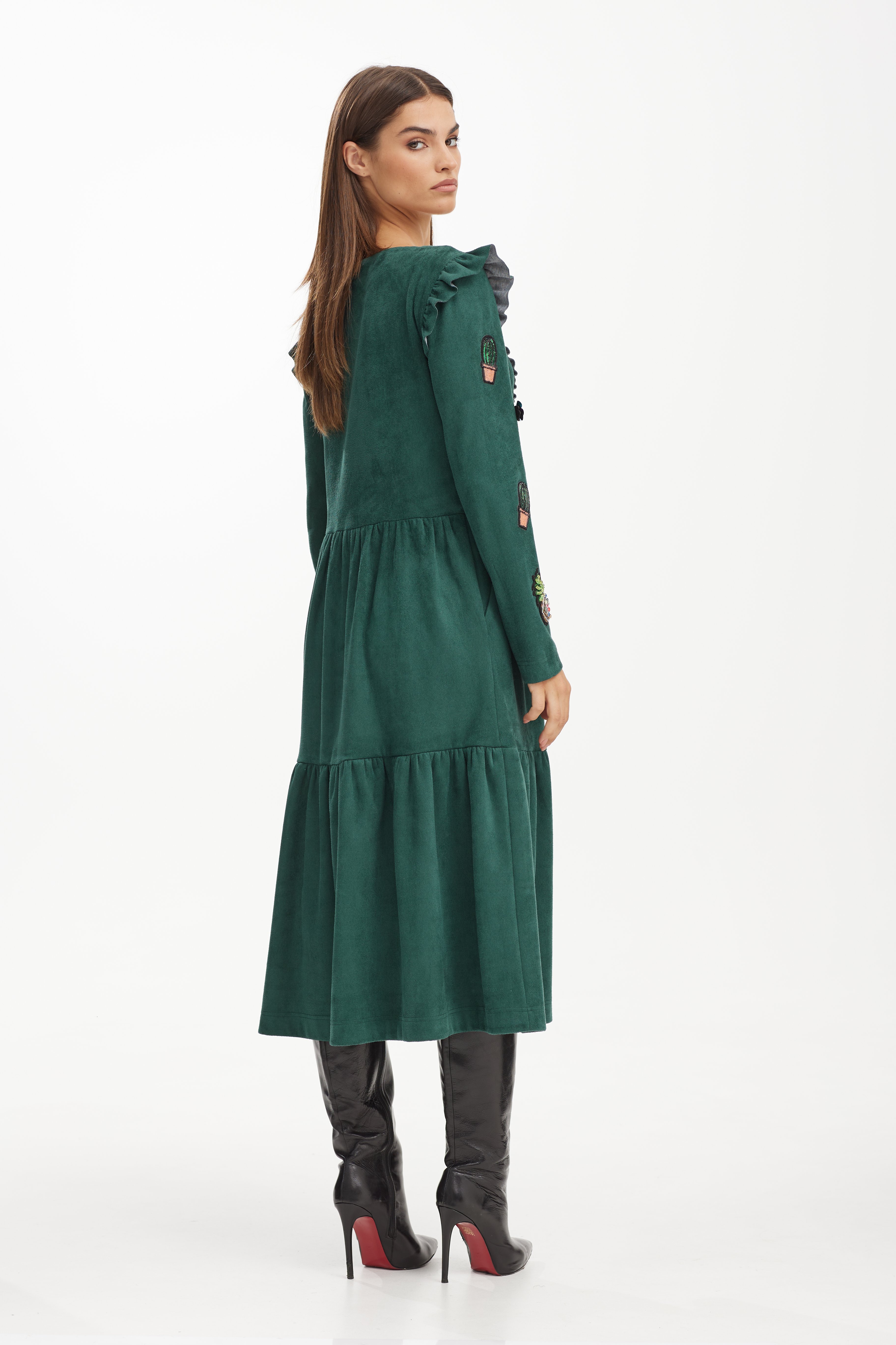 Платье 42-52 5500 Изящное модное платье из замшевого трикотажного полотна.. Модель свободной формы полуприлегающего силуэта расширенное к низу. Платье отрезное чуть выше линии талии с двумя ярусами воланов.Рукава платья декорированы дизайнерскими аппликациями ..