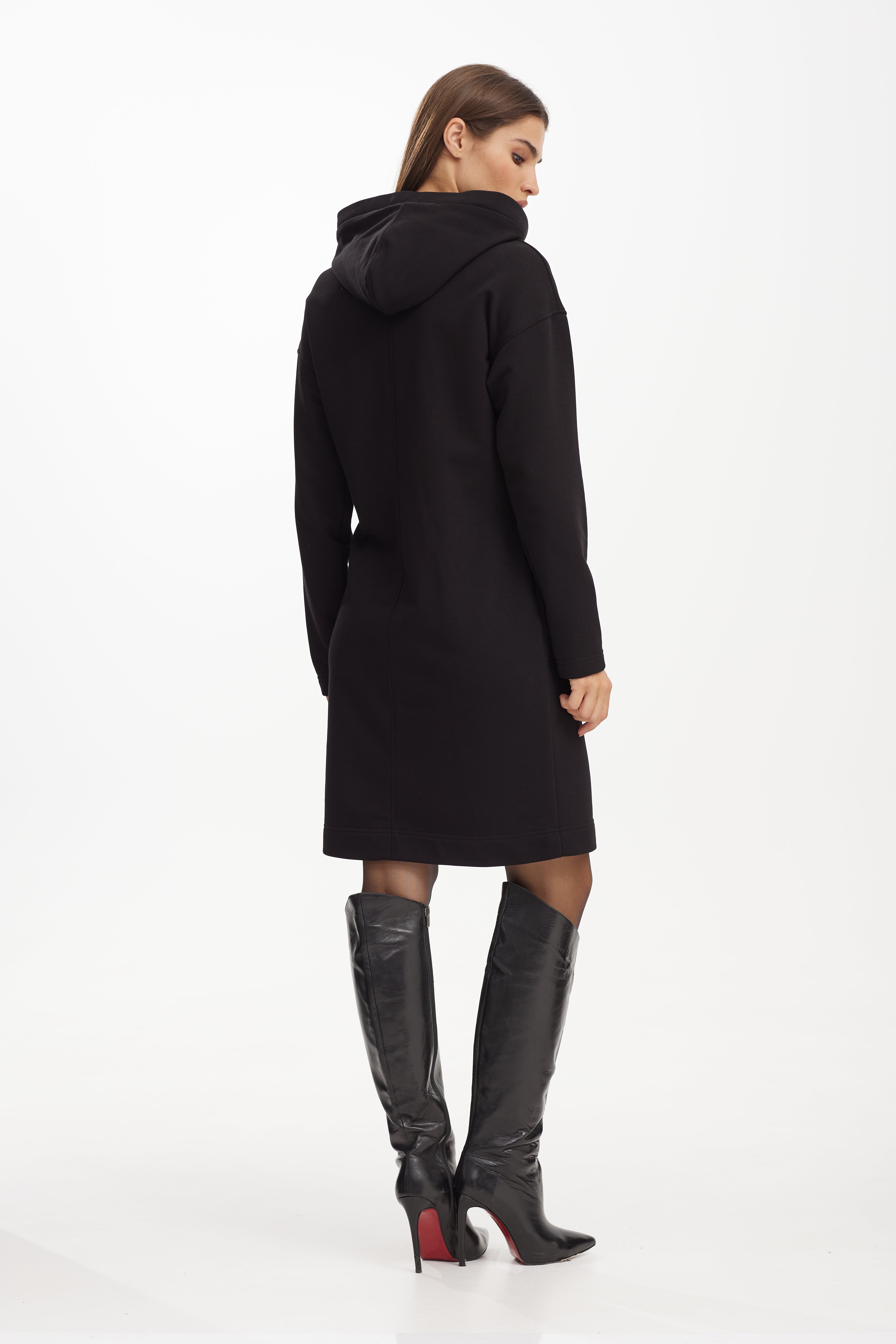 Платье 42-52 4650 Элегантное трикотажное платье прямого кроя.Платье имеет слегка спущенную линию плеча. В горловину вставлен капюшон .