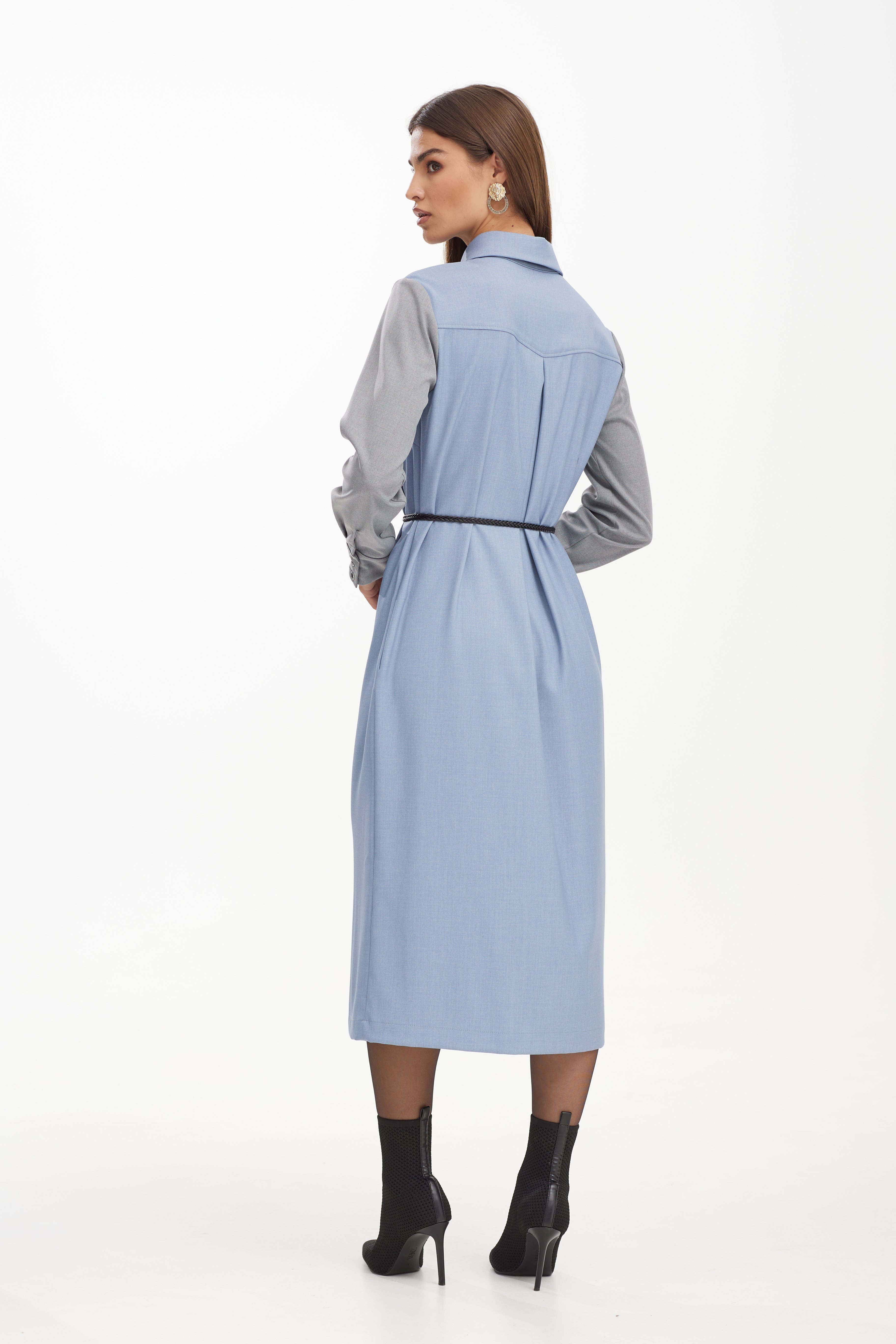 Платье 42-52 4660 Стильное женское платье из костюмной ткани. Платье полуприлегающего силуэта с втачными рукавами и рубашечным воротником. Перед с застёжкой на петли и пуговицы по планке .Перед платья декорирован дизайнерской вышивкой . Пояс в комплекте.