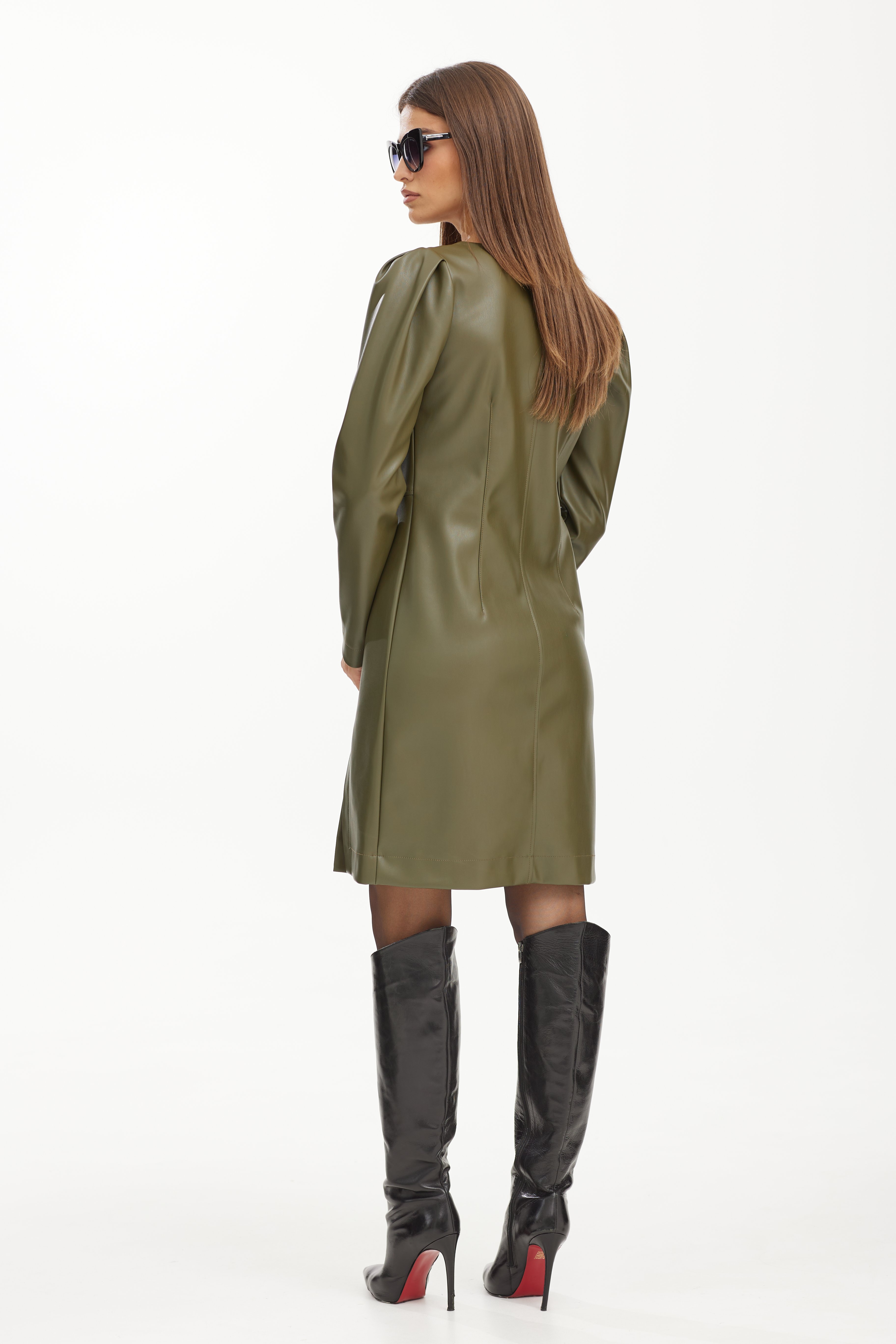 Платье 42-50 3800 Мини-платье из экокожи с замшевой. Облегающий лиф выполнен из нескольких частей. Спинка со средним швом и талиевыми выточками. По переду юбки разрез. По окату рукава выполнены складки.