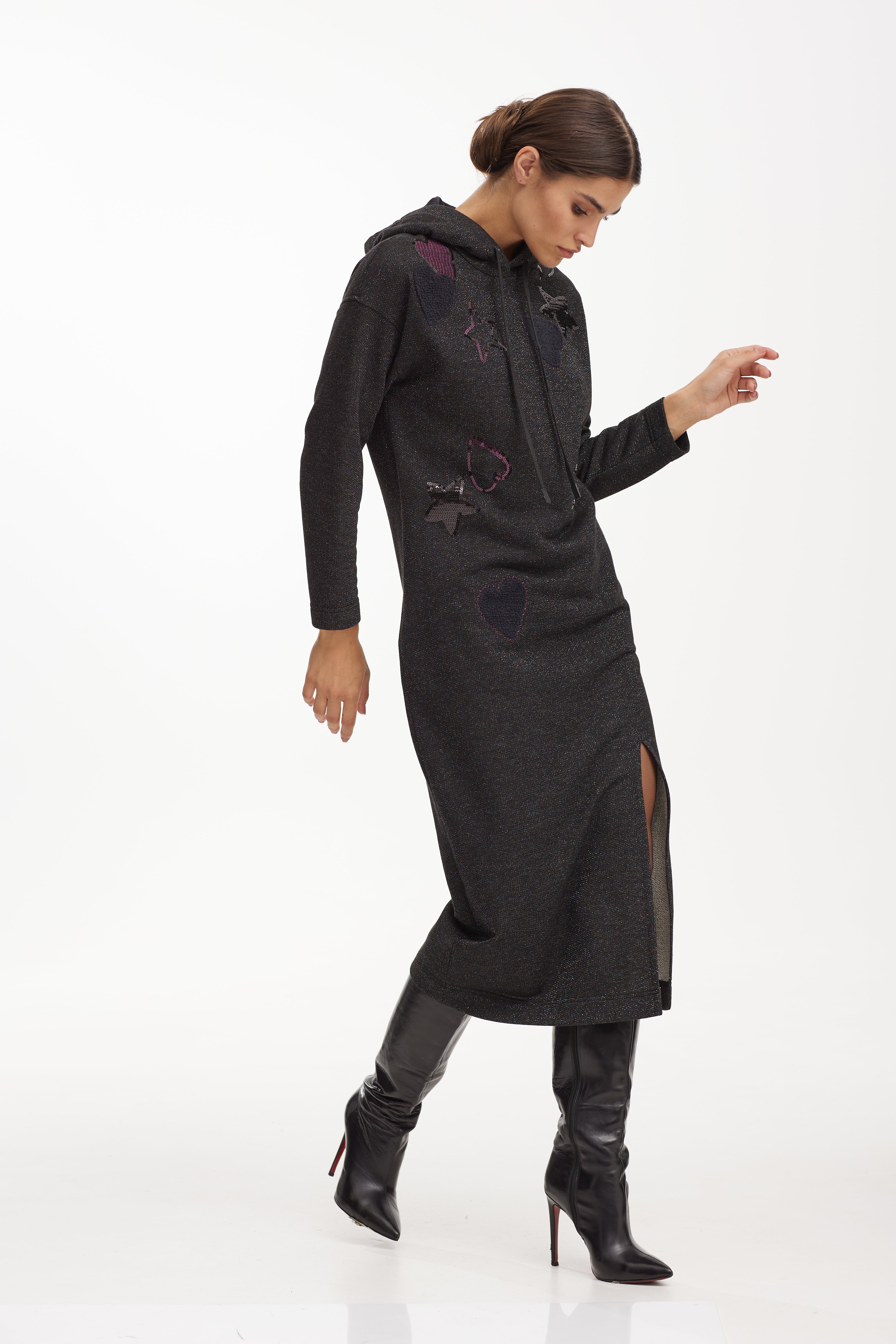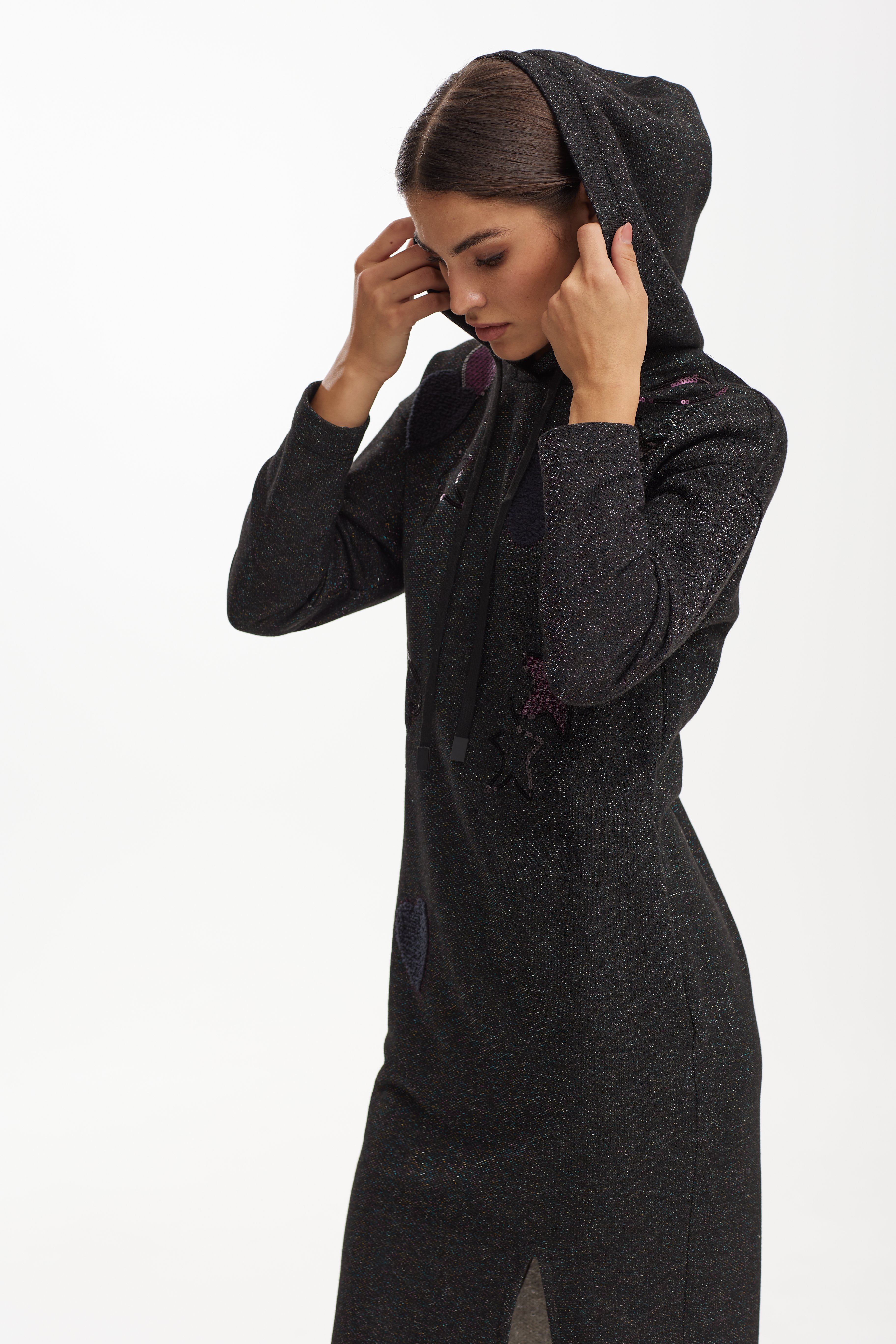 Платье 42-52 4230 Элегантное трикотажное платье прямого кроя.Платье имеет слегка спущенную линию плеча. В горловину вставлен капюшон .