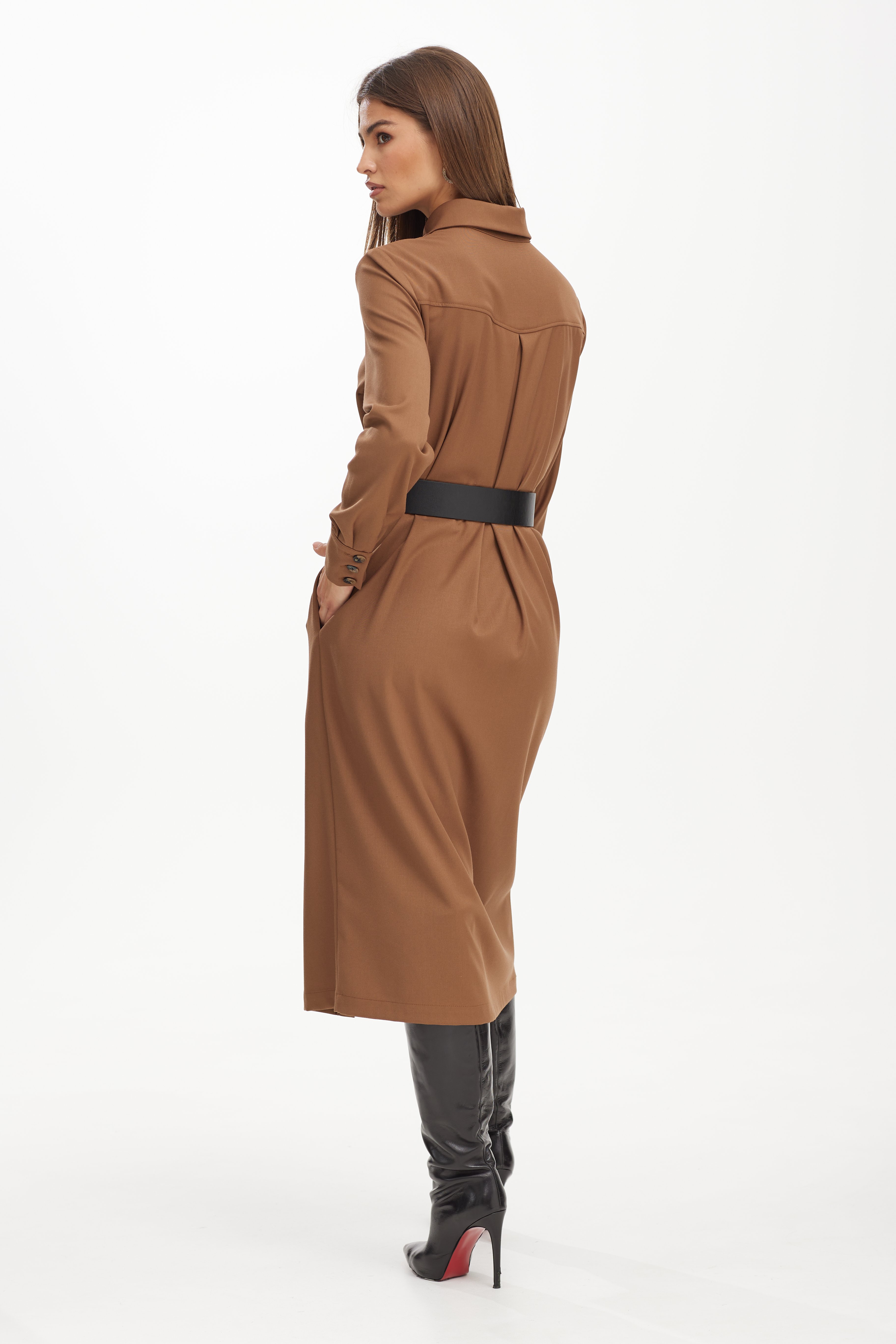 Платье 42-52 5600 Стильное женское платье из костюмной ткани. Платье полуприлегающего силуэта с втачными рукавами и рубашечным воротником. Перед с застёжкой на петли и пуговицы по планке .Перед платья декорирован дизайнерской вышивкой . Пояс в комплекте.