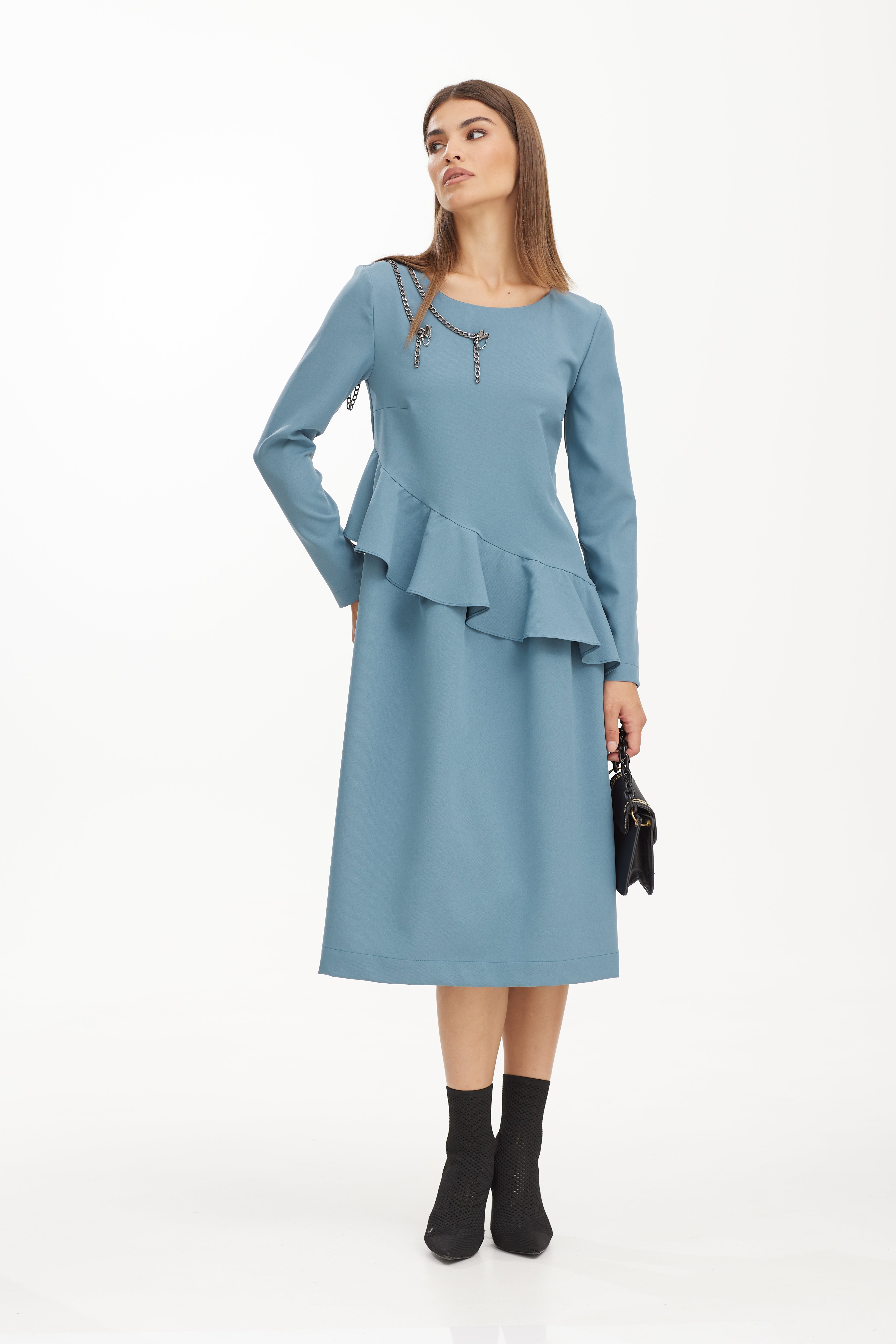 Платье 42-50 4550 Элегантное уютное платье из итальянского крепа прямого силуэта. Модель свободной формы полуприлегающего силуэта с овальной горловиной. Платью придает оригинальности декорированный ассиметричный подрез , в которые вставлен волан .