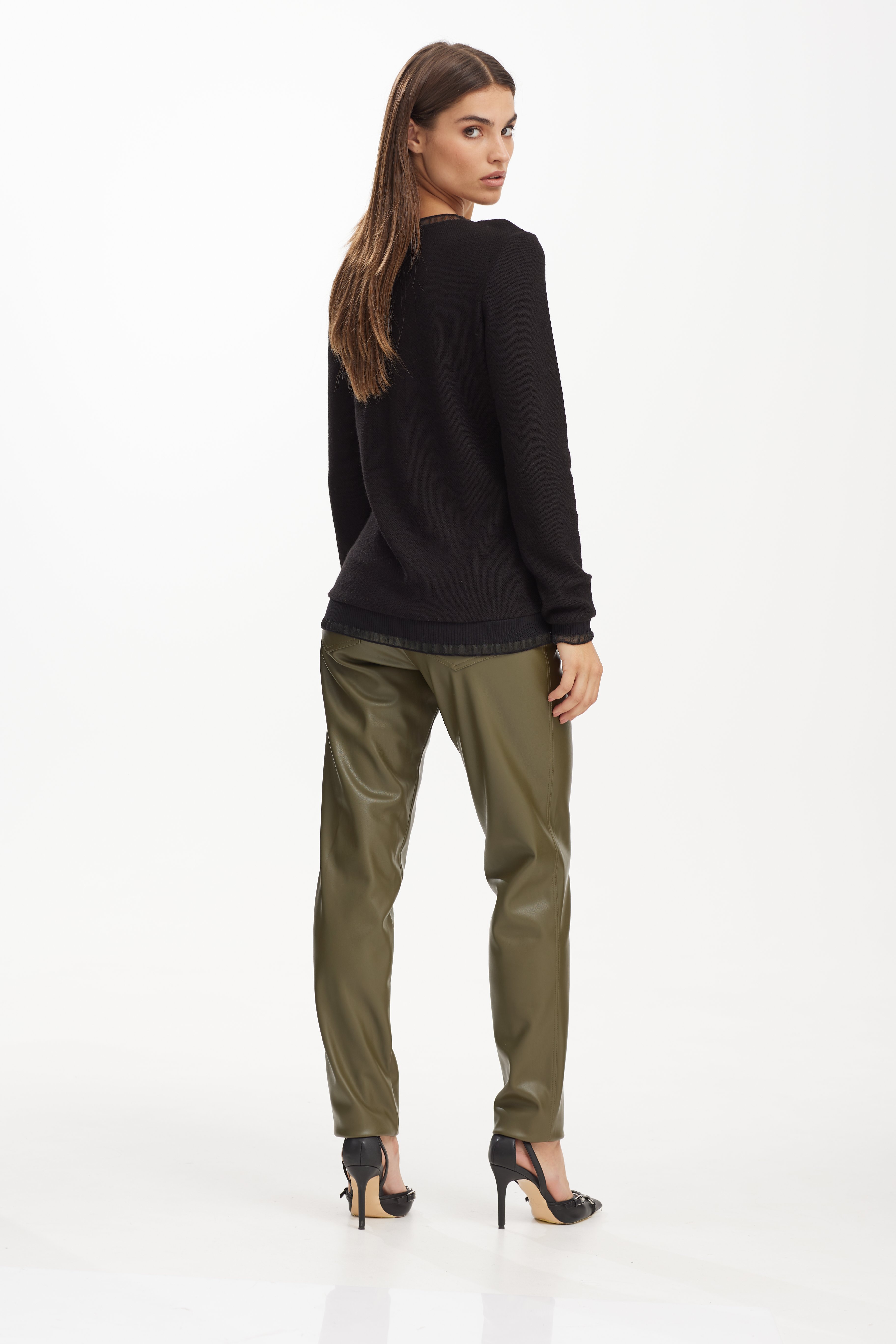 3650 Женские брюки из экокожи сочетают в себе удобство. Брюки с завышенной посадкой, на поясе, с боковыми карманами. Модель универсальная и может служить стильной базовой вещью в вашем гардеробе.