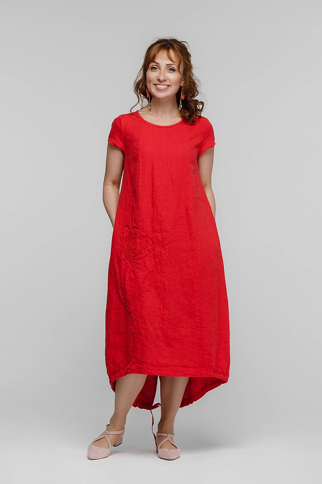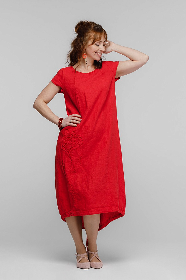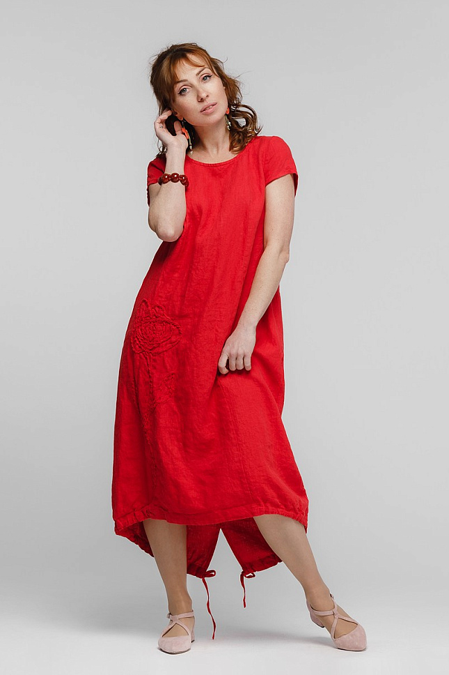 Согласитесь, весьма затруднительно найти модель платья, которая и удобная и оригинальная одновременно?! Зачастую, в угоду красоте дизайнеры жертвуют комфортом и наоборот. А если речь идёт о летнем периоде, когда жарко, ситуация усложняется в разы. Со всеми этими трудностями прекрасно справляются модели марки Kayros, выполненные в стиле Бохо. Представленная модель платья своим внешним видом «выбьется» из череды обыденных повседневных «нарядов». Свободный крой А – силуэта подарит невероятный комфорт и свободу движений. Благодаря такому крою и длине миди – вы можете забыть о своих тревогах на тему несовершенства фигуры. Разновеликая длинна в сочетании с кулисой по низу – придают пикантности образу. Верх модели лишён нарочитого декора и конструктивных элементов – круглый вырез горловины, рукав малой длины и рельефные швы. Всё внимание сосредоточено на флористическом рисунке, выполненном из основного материала, который настрочен на полочке. Необработанные срезы натурального льна создают витиеватый объёмный рисунок, от которого невозможно отвести взгляда.