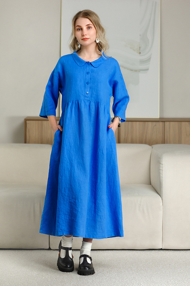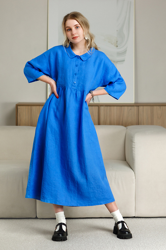 Есть платья красивые, а есть платья удобные. Зачастую эти два понятия сложно сочетать в одной модели. Дизайнеры марки Kayros представляют вам модель платья, которое сочетает в себе стиль и комфорт. Неповторимая жатая текстура льна позволяет продемонстрировать самобытный стиль Бохо с элементами Casual. Прямой свободный силуэт подчёркнут длинной миди, что не может не порадовать особ, имеющих претензии к своему телосложению. Это решение выгодно скрывает несовершенства фигуры. Одновременно с тем, дарит комфорт при использовании. Округлый подрез в области талии визуально вытягивает силуэт по вертикали, создавая стройные черты. Спущенная линия плеча – создаёт плавные мягкие формы лифа платья, которые стилистически подчёркнуты мелкой сборкой по талии и округлой формой отложного воротника. Застёжка - планка на мелкие пуговки также нацелена на демонстрацию нежного женского образа.