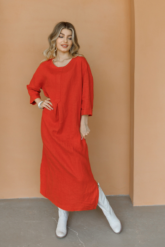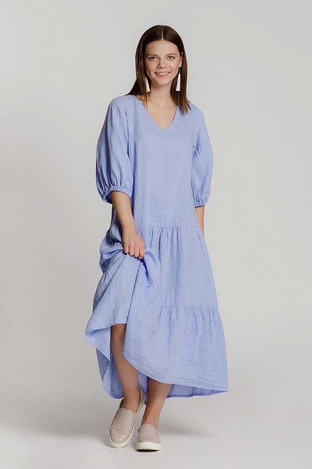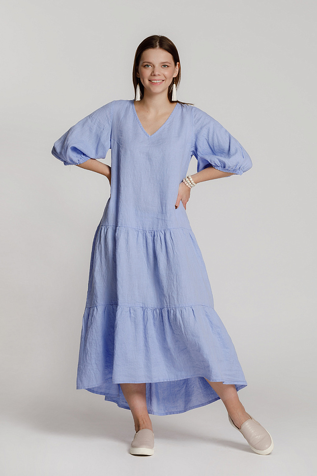 Женская натура весьма переменчива в своих поступках и желаниях. А вещи из её гардероба должны соответствовать настрою хозяйки. Именно поэтому они должны быть самые разнообразные. Так сказать – «на все случаи жизни». Дизайнеры марки Kayros представляют вам модель льняного платья, которое способно предвосхитить самые разные желания женщин и девушек. Объёмные формы рисуют новые пропорции женского тела, которые приковывают к себе внимание. Свободный крой в сочетании с многоярусной юбкой создают женственный А – силуэт, благодаря чему выгодно скрыты проблемные участки фигуры. Одновременно с этим, подобное силуэтное решение на практике подарит массу комфорта. Задняя часть платья имеет большую длину относительно передней, что позволяет продемонстрировать красоту новых туфель или босоножек. Лиф платья не может похвастаться разнообразием декора. Главной особенностью и украшением модели являются объёмные рукава, низ которых присобран на эластичную тесьму. Мягкий и плавный объём в нижней части - подчёркивает утончённые женские руки. А V – образный вырез горловины создаёт привлекательную линию декольте.