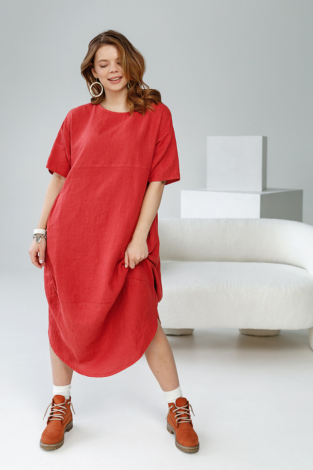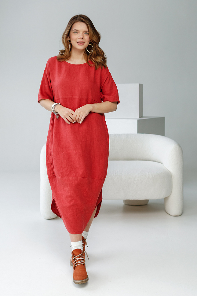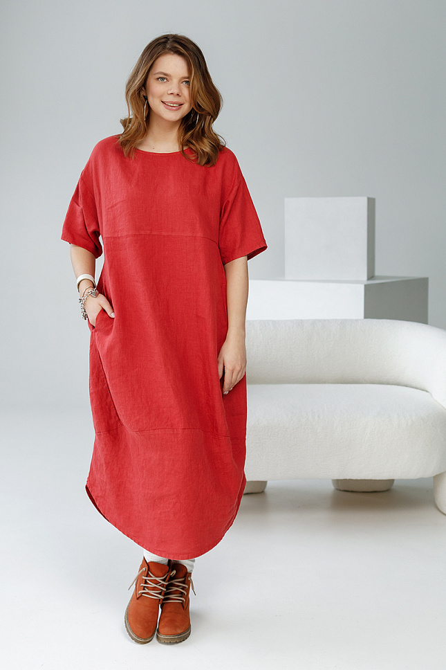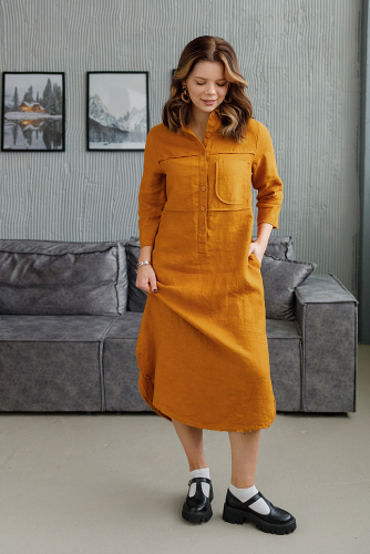 Уверенная женщина может позволить себе любые эксперименты в области моды и стиля. Тем самым подчёркивая свою индивидуальность. А если вы таковой не являетесь, стоит попробовать магию преображения. В этом случае вы будите приятно удивлены на сколько кардинально одежда способна изменить не только ваш образ, но и мироощущение. Для подобных начинаний прекрасно подойдёт представленная модель платья. Фактурный лён прекрасно воплотил замысел дизайнера по созданию стиля Бохо. Такой яркий и харизматичный, он покорил уже большое количество женских сердец. Свободный крой модели, и натуральный материал обеспечат вам максимальный комфорт. Длина миди создаёт роскошный и статный силуэт. Изогнутый срез низа акцентирует на себе внимание, поэтому рекомендуем внимательно подойти к подбору обуви. В данном случае она может быть самой разнообразной как на каблуке, так и на сплошном ходу. Благодаря увеличенной длине плеча силуэтные черты лифа – плавные и мягкие. Свободные формы лаконично дополнены широким рукавом до локтя. Карманы в боковых швах придают большую функциональность. Модель не может похвастаться нарочитым декором, всё сдержано и «немногословно». Вся индивидуальность сосредоточена на силуэте и материале.