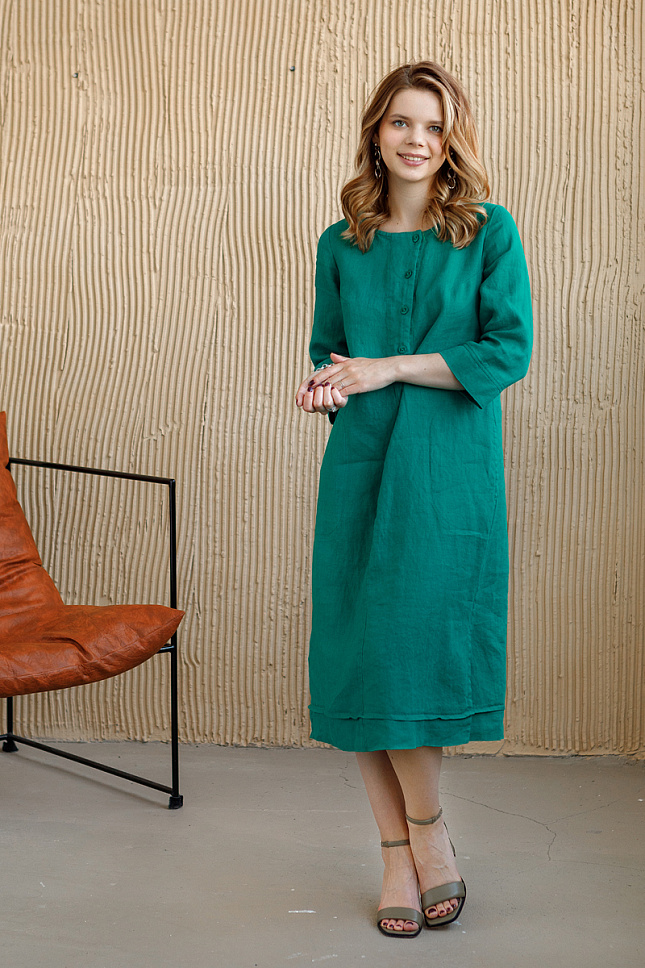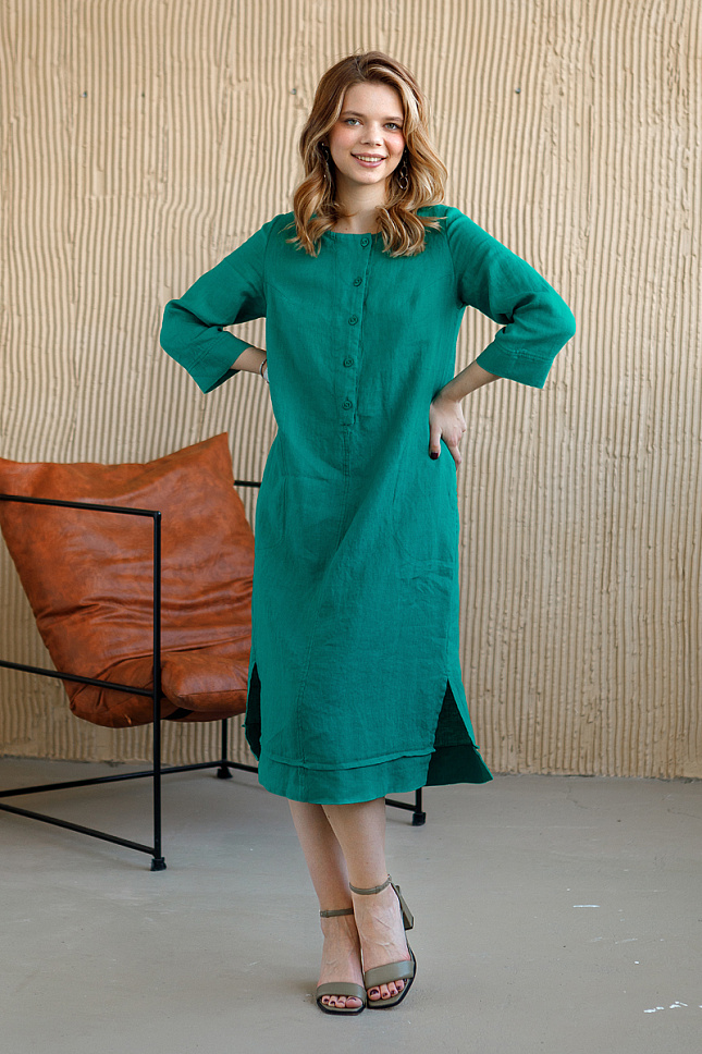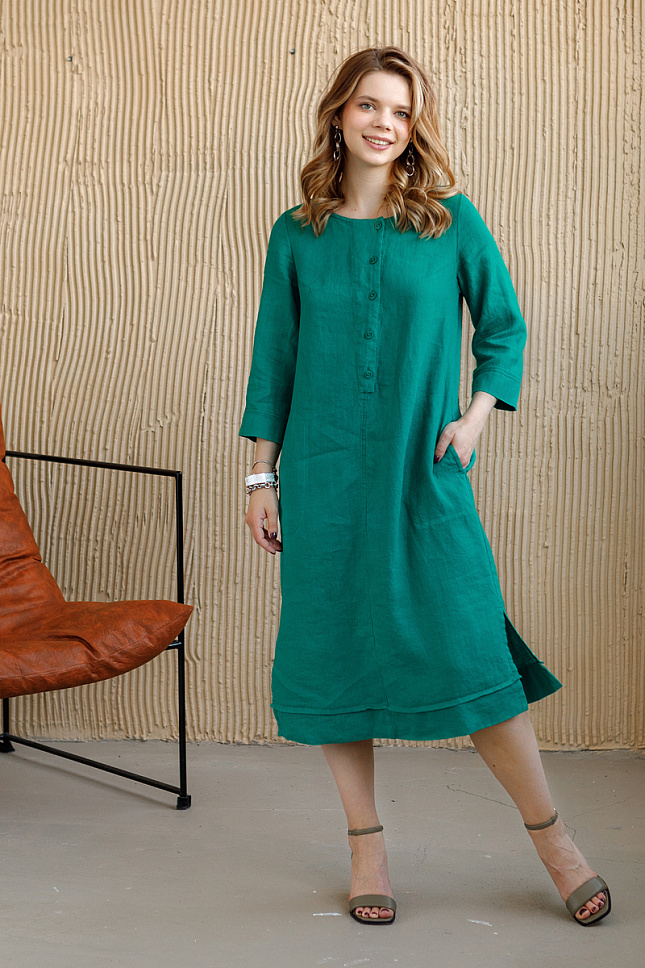 Вы с трепетом ждали тёплого сезона, чтобы надеть своё любимое летнее платье или пойти в магазин за «очередным»!? И когда наступает этот волнительный момент, вы не всегда к нему готовы. И тут наступает мучительная трата времени на поиски «идеального платья» для себя. Наши дизайнеры предлагают обратить внимание на представленную модель льняного платья! Да, возможно, оно расходится с вашими представлениями о кокетстве и женственности, но уверяем – это прекрасная лаконичная модель, которая прослужит долгие годы, будет актуальной и вызовет неподдельный интерес у вас во время примерки. Прямой силуэт настолько комфортен, что вы не захотите его снимать. Он стильно скрывает все несовершенства фигуры, даря вам уверенность в каждом действии. Длина чуть ниже колена – сейчас актуальна как никогда. Прекрасно сочетается с любой обувью, будь то каблук или плоская подошва. Застёжка поло в сочетании с разрезами в боковых швах и манжете по низу демонстрируют нам спортивный характер модели. Платье не обременено каким – либо воротником, что даёт возможность удобного сочетания с различными жакетами. Длина рукава 7/8 и карманы в боковых швах – удобное решение на каждый день.
