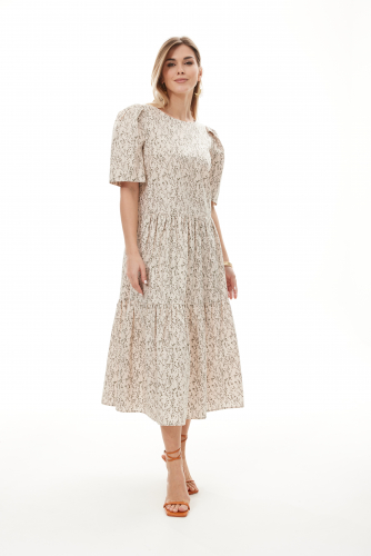 Платье (Белый цвет) 42-52 4300 Современное стильное платье из итальянского дизайнерского хлопка. Платье удлиненное, расширенного силуэта, с изящным вырезом горловины и широким воланом со сборкой по низу.