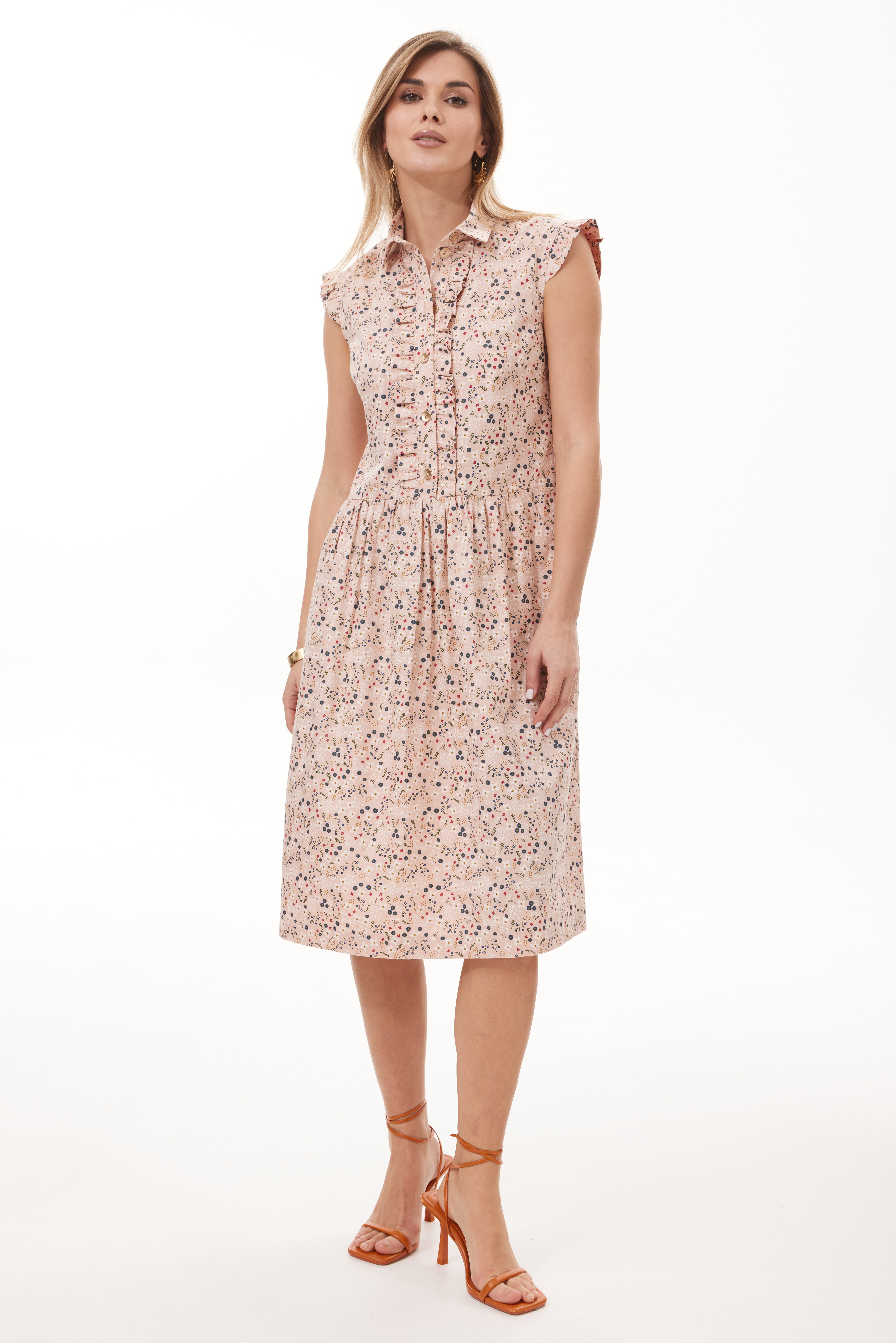 Платье (Пудровый цвет) 42-50 4000 Стильное женское платье из французского цветочного хлопка. Платье полуприлегающего силуэта отрезное по линии талии, с рубашечным воротником. Перед с застежкой на петли и пуговицы. Нижняя часть платья со сборкой по талии, в боковых швах карманы.