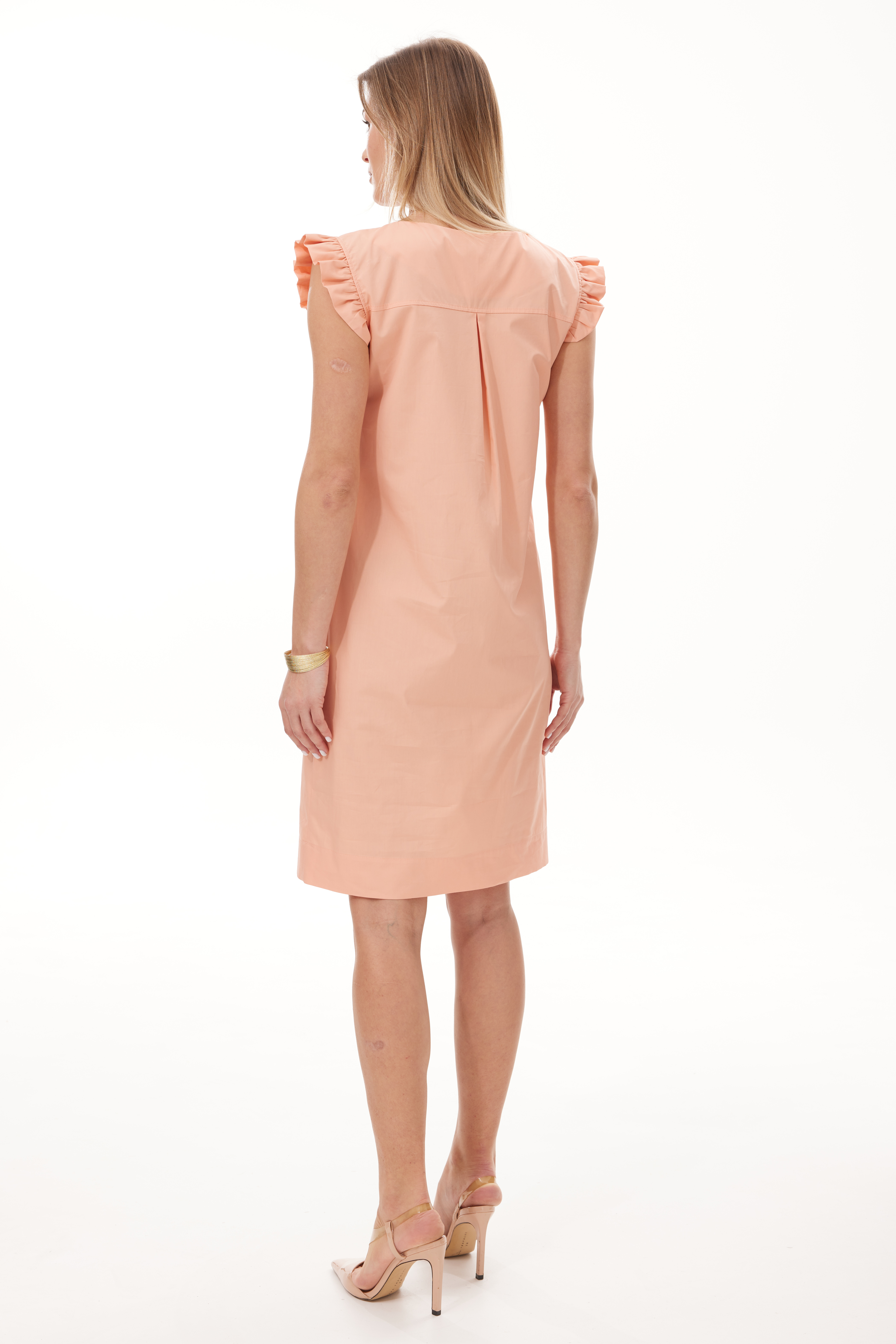 ( цвет персиковый) 42-50 4360 Платье прямого покроя, из хлопкового полотна .Модель сочетает в себе женственность и удобство. Перед декорирован дизайнерской вышивкой.