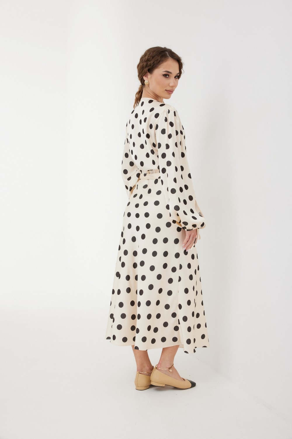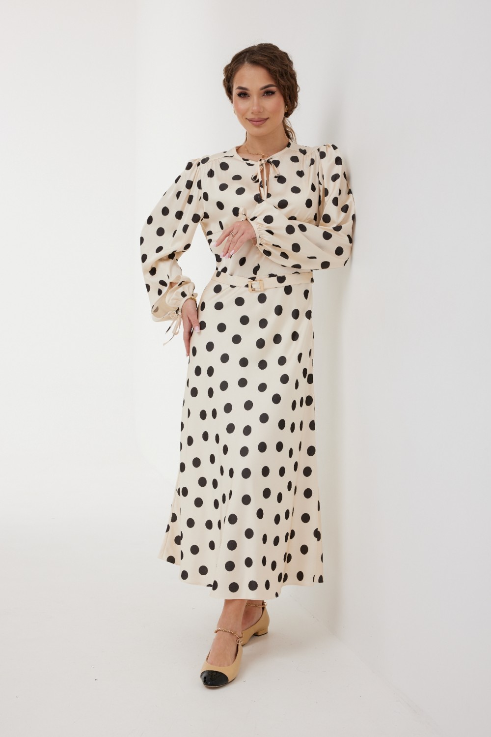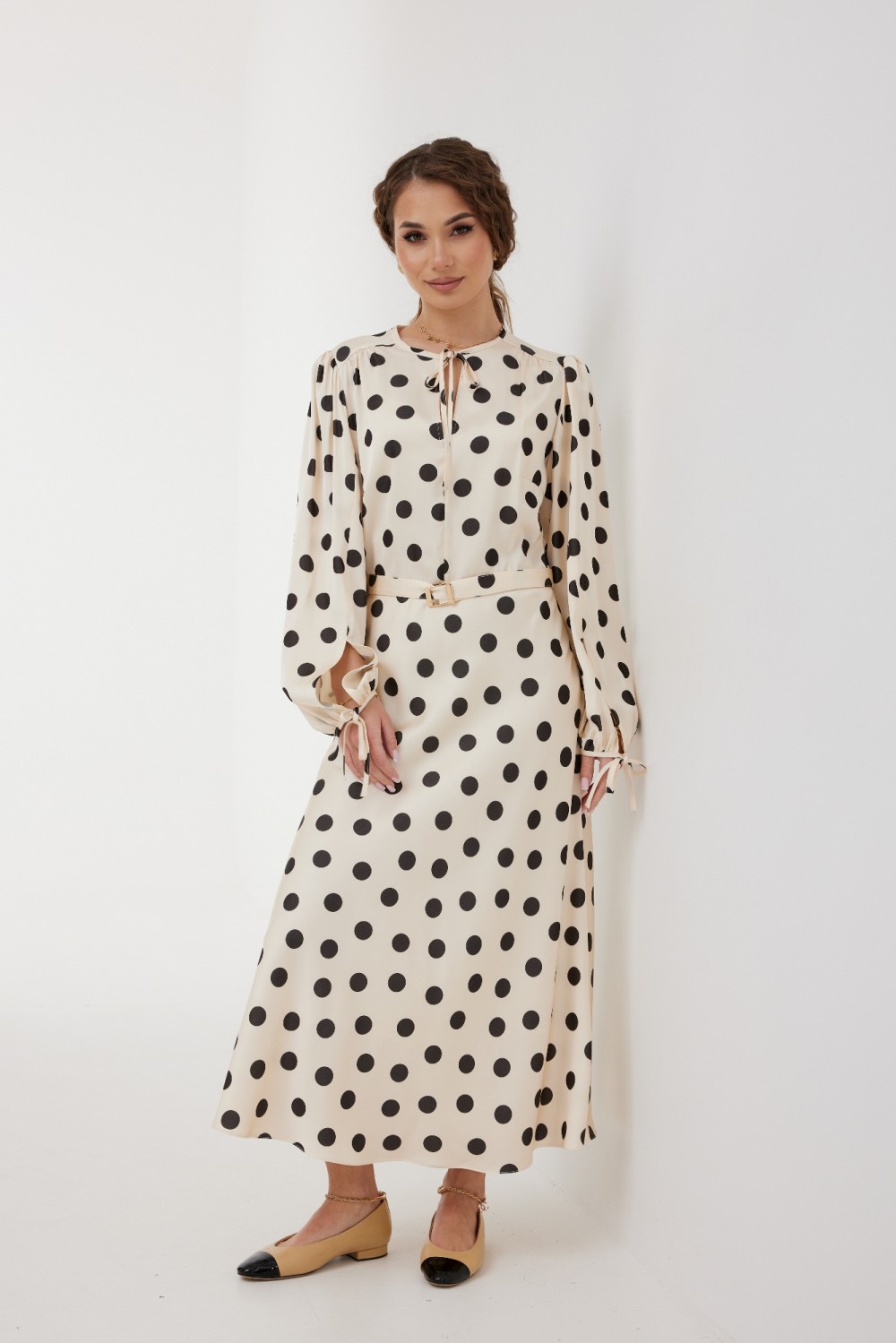 Подкладка: 100 % ПЭ" 164-170 см. Платье женское нарядное, полуприлегающего силуэта, отрезное по линии талии, юбка косого кроя, на подкладке, расширенная книзу.Рукав втачной со сборкой в верхней части и по низу, по переднему шву рукава обработан разрез, низ рукава окантован бейкой, переходящей в завязки.Лиф с переходящим плечевым швом на перед, нагрудными вытачками, по спинке - с талиевыми вытачками, по плечевым швам небольшая сборка, по переду средний шов, горловина окантована бейкой, переходящей в завязки.  Длина платья ниже колена.