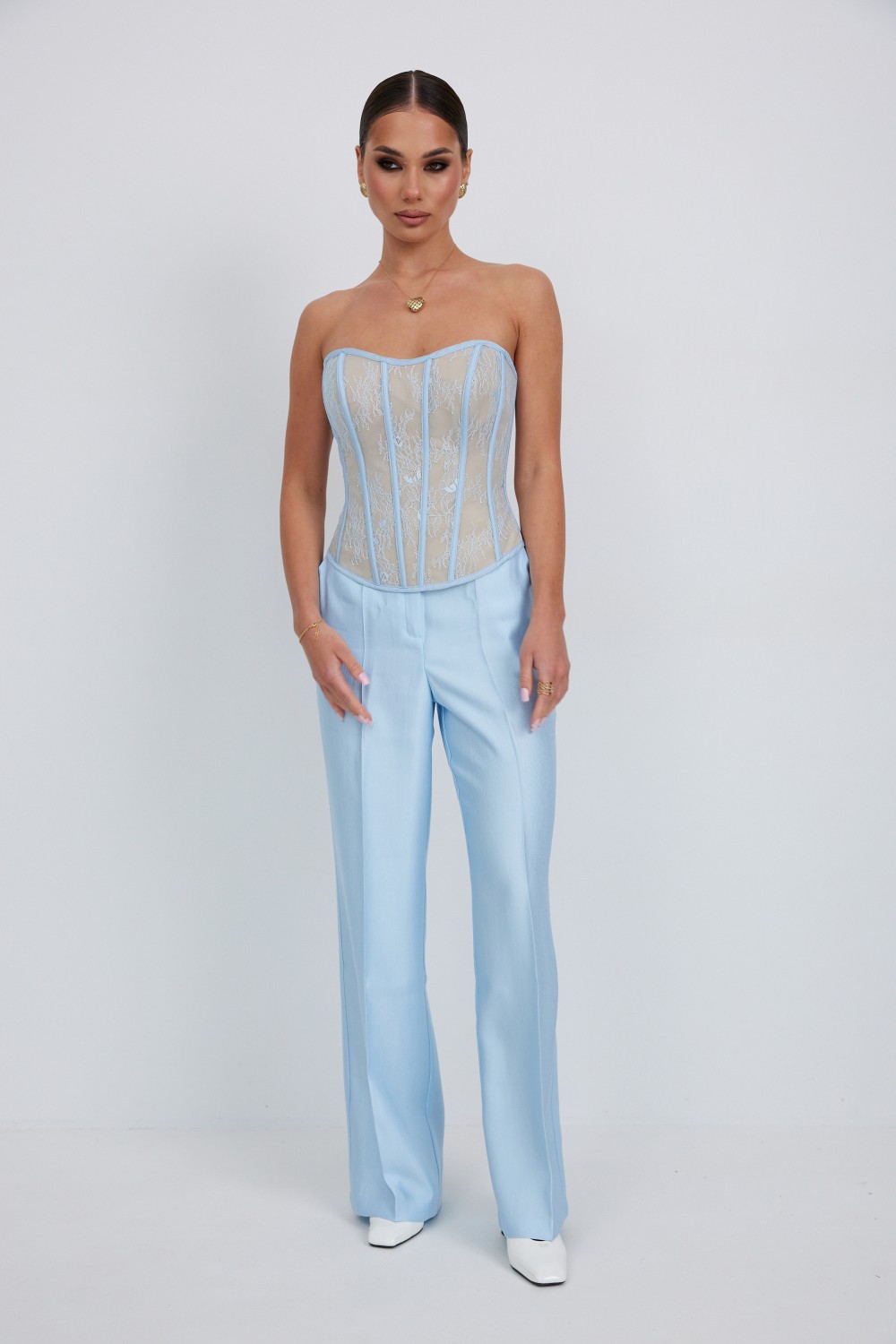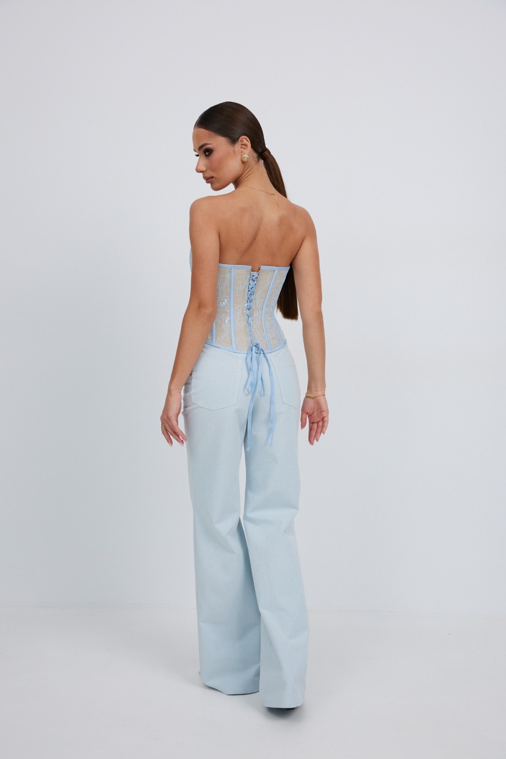 кружева с сатиновой подкладкой, прилегающего силуэта. По спинке шнуровка. По